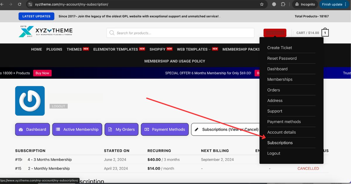 • Once you are in the Subscriptions section, find the active subscription you wish to cancel. The subscription section is highlighted or marked  by a red arrow in the given image. Click on it to process.