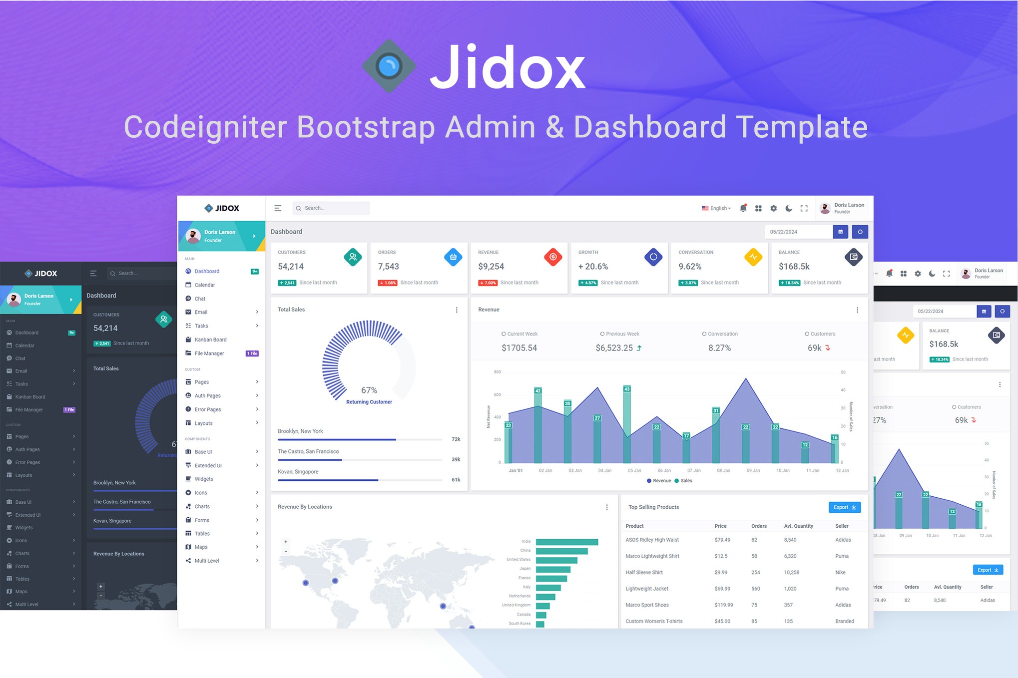 Jidox is a versatile admin dashboard template designed with Bootstrap CSS v5.2.3 and Codeigniter. This premium template offers a range of UI elements, components, widgets, and pre-built pages perfect for creating web applications efficiently. With three layout options, including light and dark mode support, Jidox caters to modern web application needs. Featuring over 150 pages, 500+ UI components, 50+ charts, and various apps like Calendar, Chat, and File Manager, Jidox is a comprehensive solution for developers seeking a responsive admin dashboard. Its stylish design, multiple layout choices, and rich features make it an ideal starting point for any project.