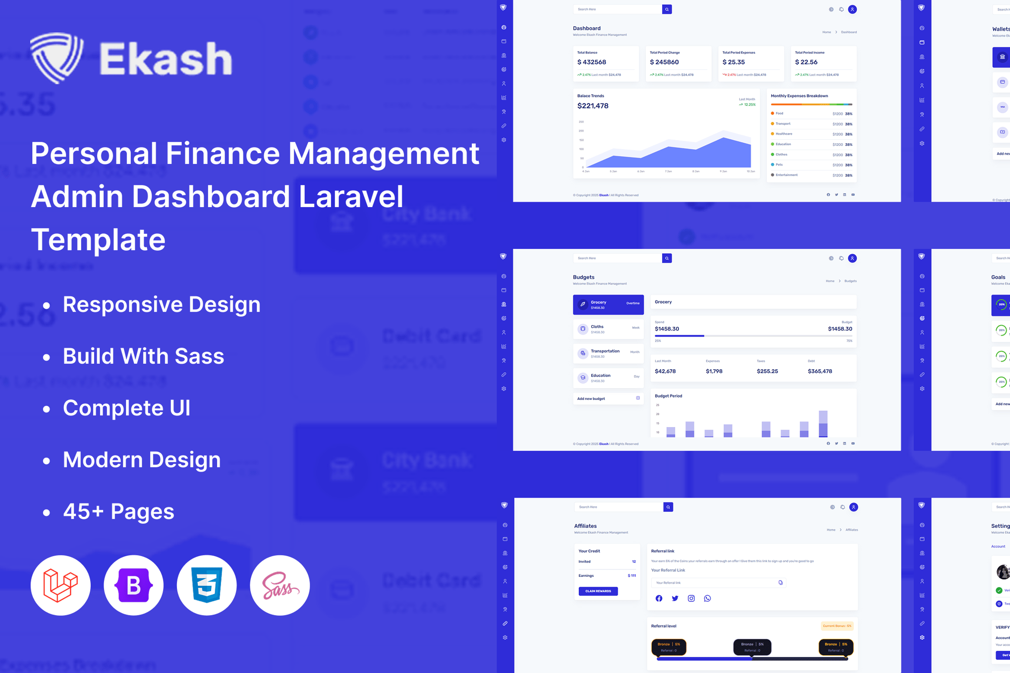 Introducing Ekash, a sophisticated personal finance dashboard template crafted with Laravel, CSS, and JavaScript. Perfect for developers creating financial web apps, Ekash features pre-designed pages for Wallets, Budgets, Goals, and Transaction History. With a responsive layout and clean design, it offers over 150 UI components, advanced charts, and data tables for effective financial data visualization. Customize Ekash with light and dark sidebar themes, and benefit from its user-friendly structure, ideal for prototyping or developing polished finance dashboards effortlessly.