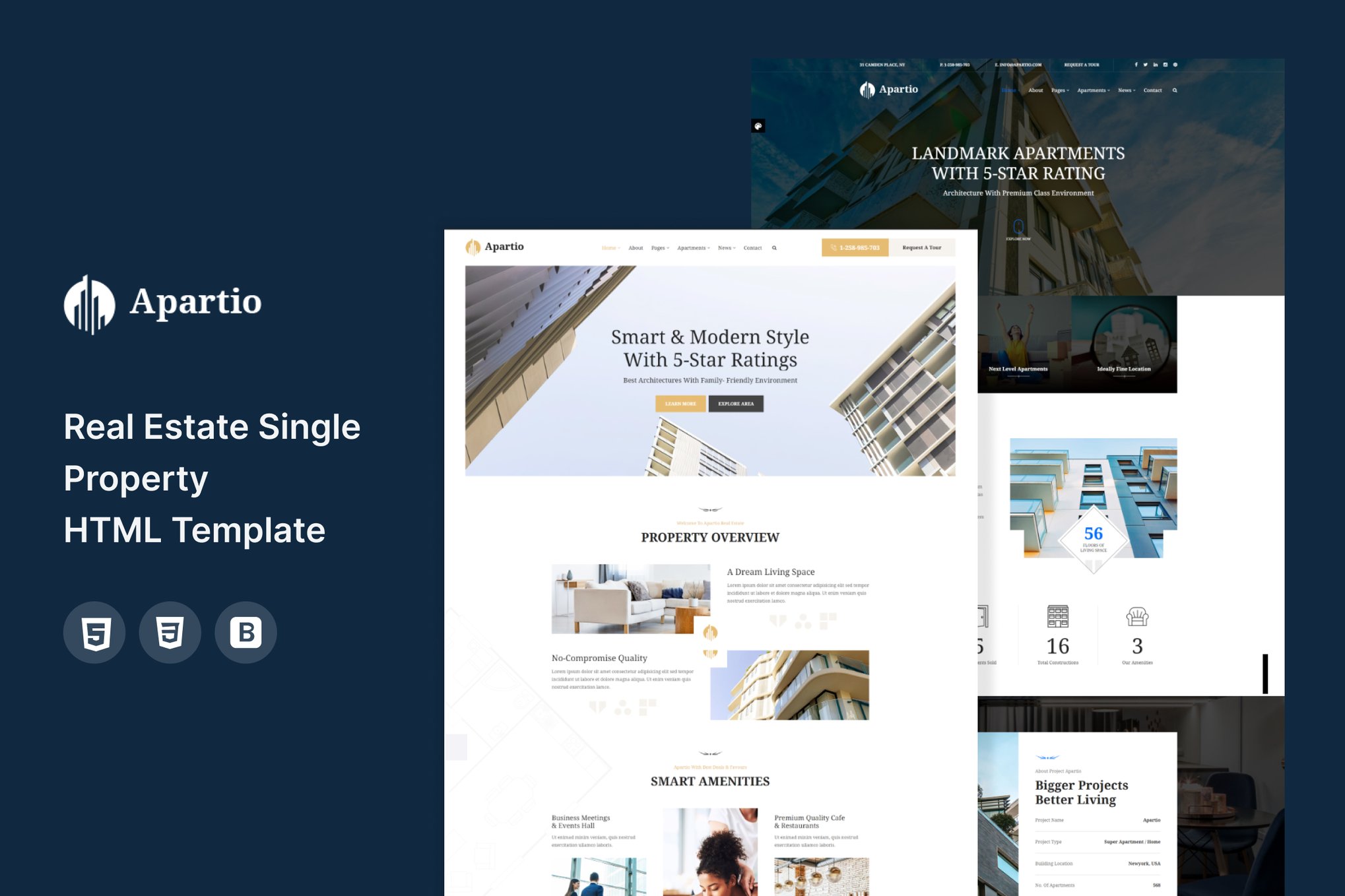 The Apartio Single Property Real Estate HTML Template is an ideal solution for showcasing and selling properties like villas, apartments, houses, and more. With its stunning and unique design, Apartio is tailored for online visibility. It boasts a fully responsive layout, ensuring an optimal viewing experience on various devices. Packed with essential features such as room descriptions, blogs, testimonials, and facilities pages, Apartio is a comprehensive choice. It is built on Bootstrap 5 and comes with valid HTML files, advanced typography, social links, and a clean, modern design. Elevate your company’s online presence with Apartio.