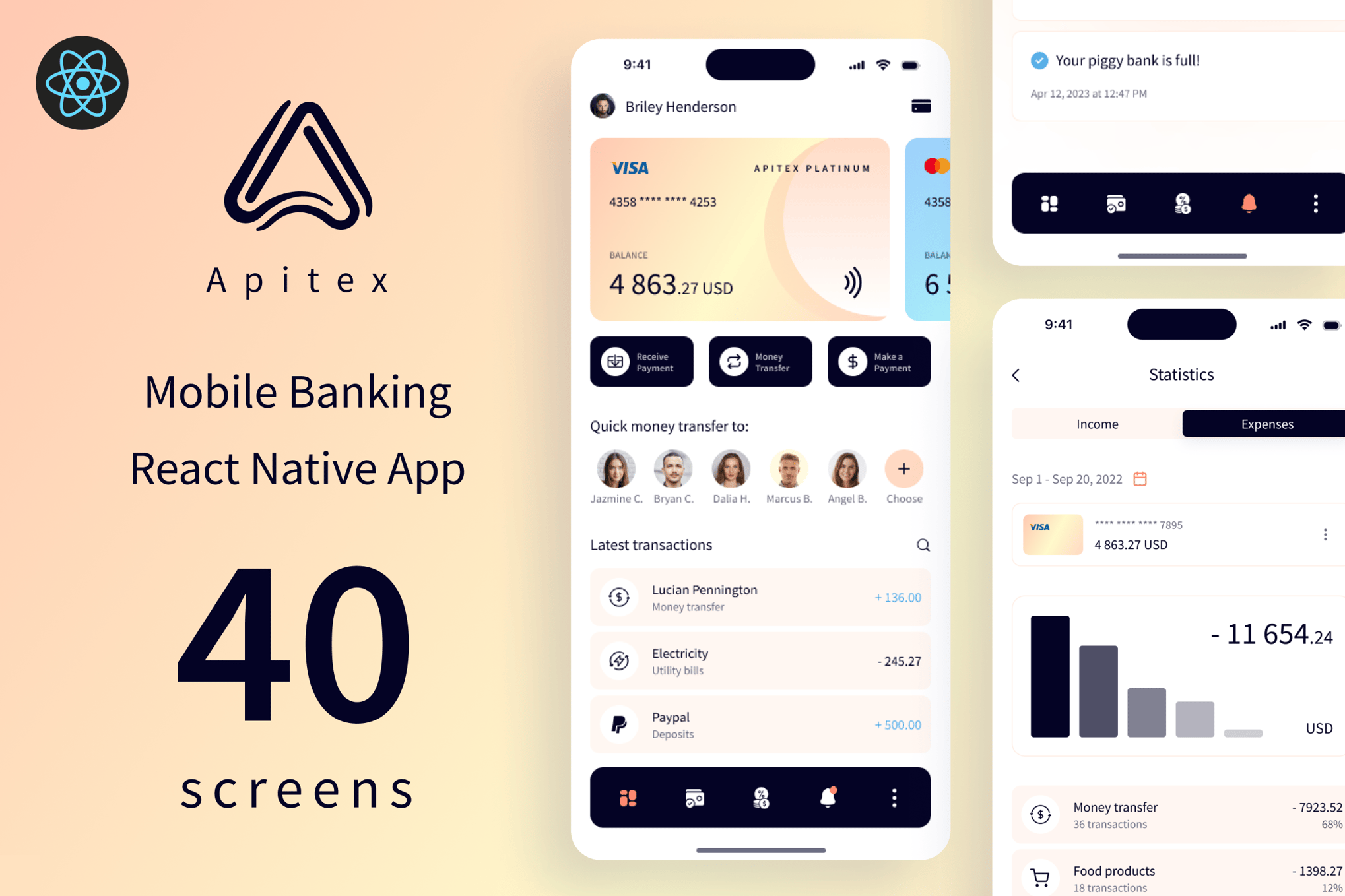 Apitex is a versatile online banking app template designed using React Native, ensuring compatibility with both Android and iOS platforms. With Apitex, users can efficiently manage their bank accounts by performing various functions such as depositing money, transferring funds, adding beneficiaries, and updating their profiles. The app also offers features to manage loans, view bank account statements, and access loan statements seamlessly.