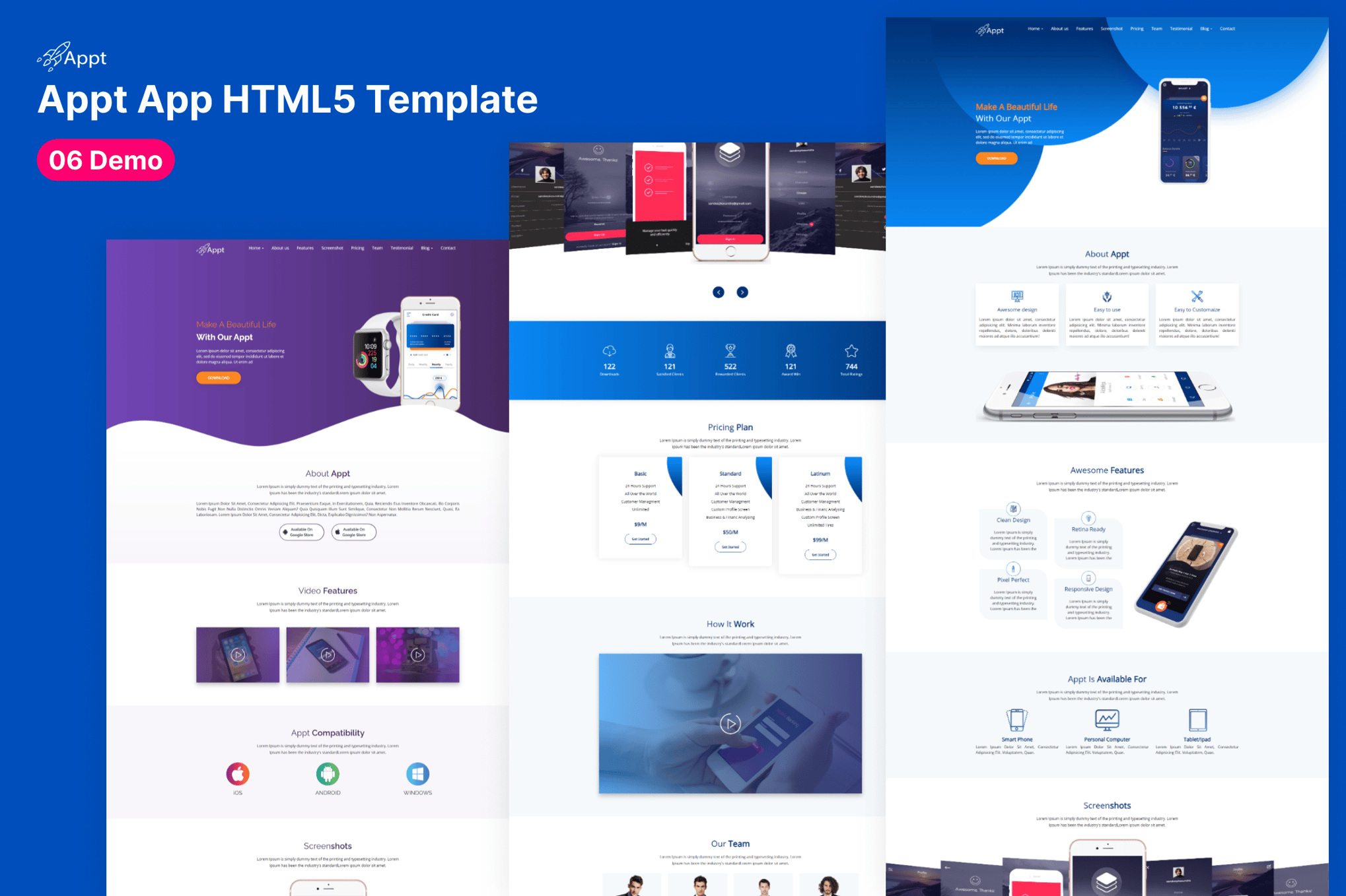 Appt is a simple yet modern HTML5 App Landing Template designed for showcasing apps with style. The HTML files are meticulously organized for easy customization and updates. This template boasts a range of features including the use of Bootstrap 3 framework, a sticky header for easy navigation, W3C validated HTML and CSS, engaging CSS animations, a downloadable video feature, and a pixel-perfect design. The clean and modern layout includes a modern slideshow, stylish social links, and fully customizable HTML files. With a responsive layout for multi-device accessibility, Appt also offers great support and well-commented code for easy understanding. It includes FontAwesome icons and Google fonts like Merriweather, Josefin Sans, and Merriweather Sans for a polished look. The template is fully compatible across browsers and features free fonts like Raleway and Open Sans, as well as Font Awesome icons.