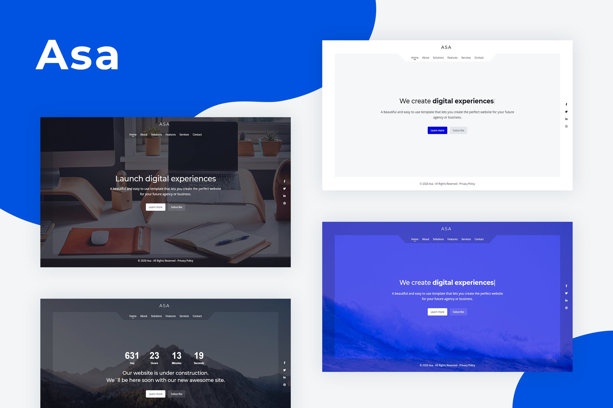 Introducing Asa, a creative and modern coming soon/under construction template ideal for creative agency businesses. With a responsive design and compatibility with Bootstrap 4.5.2, this template includes 32+ HTML files and 9 background styles to choose from. Features such as Mailchimp integration, AJAX subscription and contact forms, and a lightbox gallery make Asa a versatile and professional choice for your online presence.