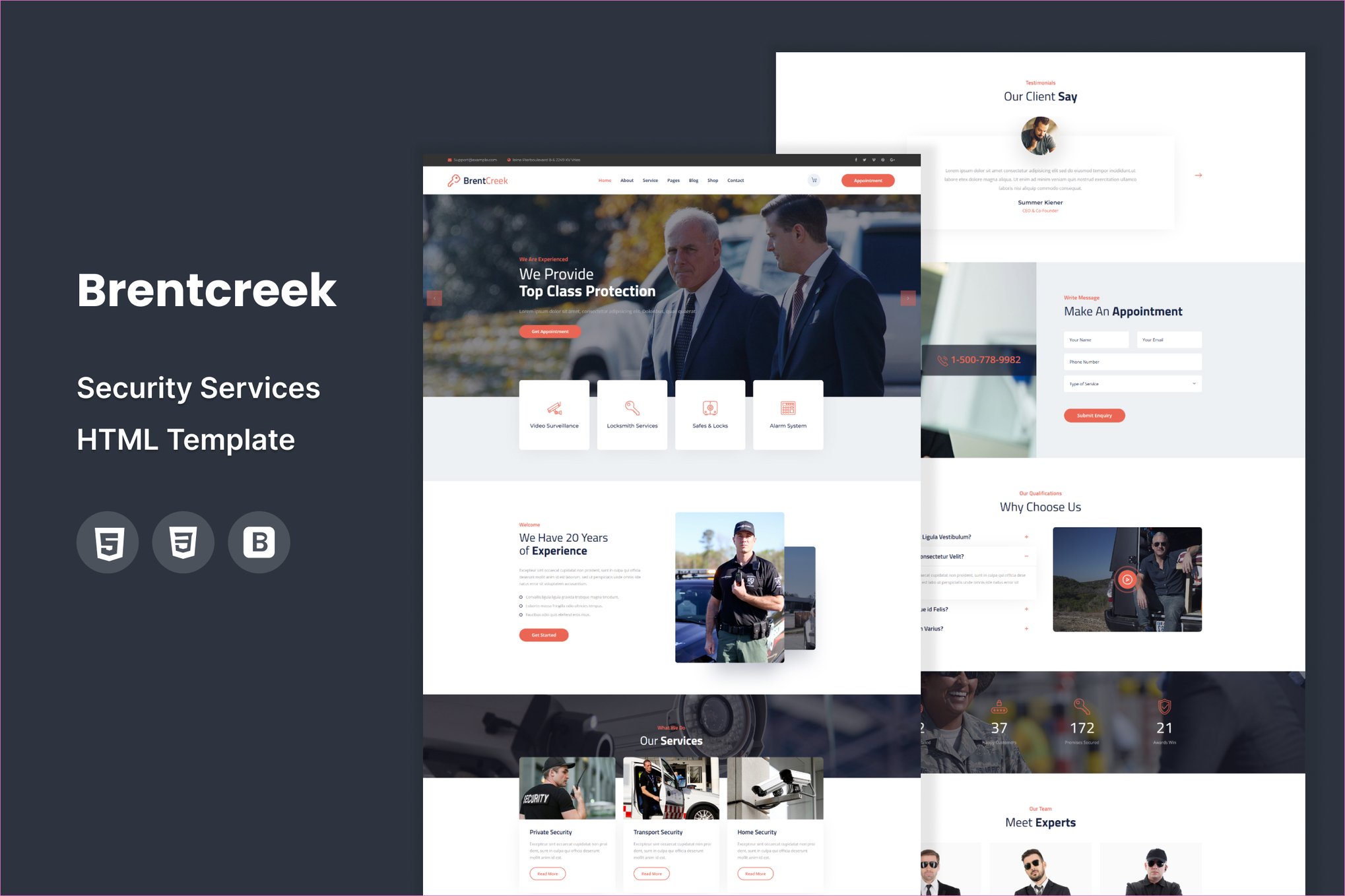 BrentCreek is a cutting-edge and completely responsive template designed using Bootstrap, HTML5, CSS3, JavaScript, and jQuery. This contemporary HTML template is perfect for a Security Service Company website, boasting a sleek design and compatibility with the latest web technologies. Its responsive layout ensures a visually appealing appearance on all devices, from desktops to mobiles. Tested across various web browsers, BrentCreek includes numerous features and is easily customizable, making it adaptable to different development platforms/frameworks. Additionally, a detailed documentation folder is provided to explain the code structures, enabling users to effortlessly create impressive websites using this template. With its myriad features, BrentCreek offers the potential to create something truly exceptional.