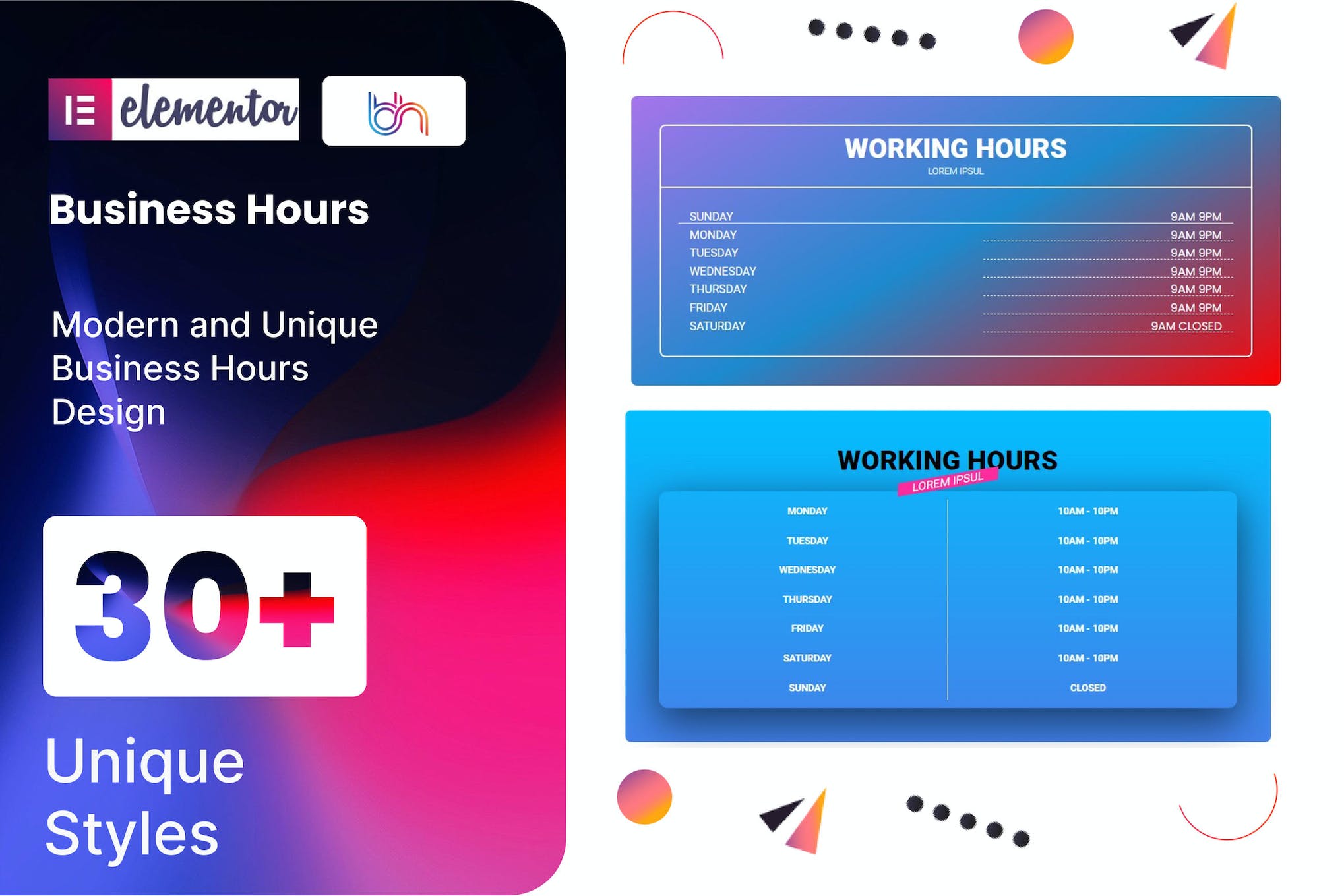 Introducing BWD Business Hours, the ultimate Elementor base WordPress plugin that effortlessly adds stunning and customizable Business Hours to your website. With over 30 unique preset designs, you can choose from a variety of visually appealing options. Creating and customizing your Business Hours section is a breeze, requiring no coding skills. This plugin is responsive, SEO-friendly, and compatible with all WordPress themes built on Elementor, ensuring a seamless user experience across browsers. Say goodbye to complicated coding and hello to a professional and efficient representation of your business hours with BWD Business Hours.