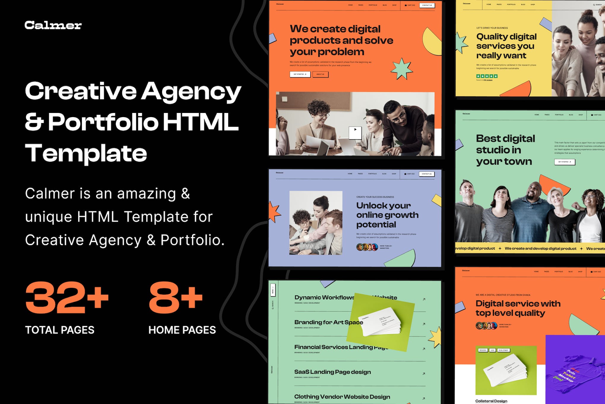 Calmer is an exceptional HTML5 Template designed for Creative Agencies and Portfolio Showcases. With 8 distinct Homepages and 32 HTML5 pages featuring a contact form, Google map integration, and numerous dynamic elements, Calmer is the ideal choice for Creative Agencies, Business Agencies, Agency Portfolios, Digital Agencies, and Corporate websites. Built on a solid foundation of the 1440px Grid System, this template combines innovation with functionality to create a visually appealing and user-friendly online presence. Elevate your digital presence with Calmer today.