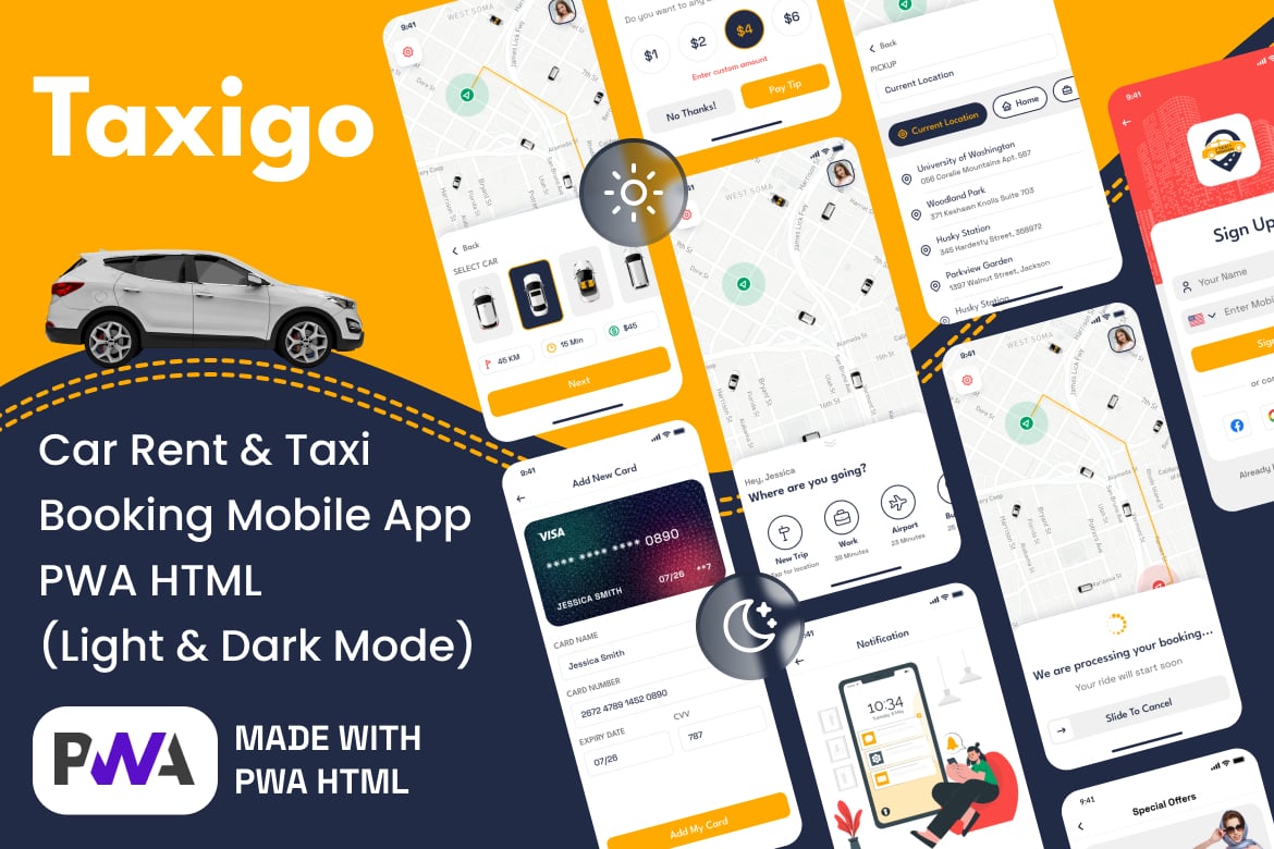 Taxigo is a versatile Progressive Web App (PWA) HTML template perfect for creating a comprehensive car rental and taxi booking mobile application. With 100+ well-designed screens, light & dark mode options, and customization capabilities, Taxigo offers a seamless user experience for both on-demand taxi services and car rentals. Enjoy responsive design, cross-browser support, and cost-effective development to launch your app quickly and efficiently.