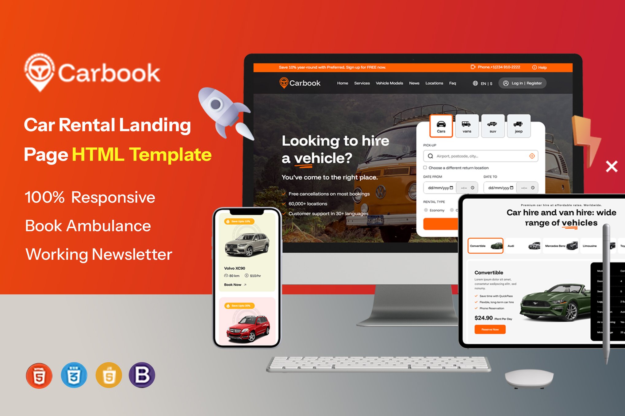 Introducing Carbook, the ultimate Car Rental and Ambulance Services Landing Page HTML Template. With its innovative design and user-friendly features, Carbook is the ideal choice to showcase and promote your services effectively. Built on Bootstrap 5, this template boasts Newsletter integration, working forms, and two unique landing page options with captivating effects in two distinct color schemes. Whether you’re in the car rental or ambulance service industry, Carbook offers a modern and responsive solution tailored for your online booking needs.
