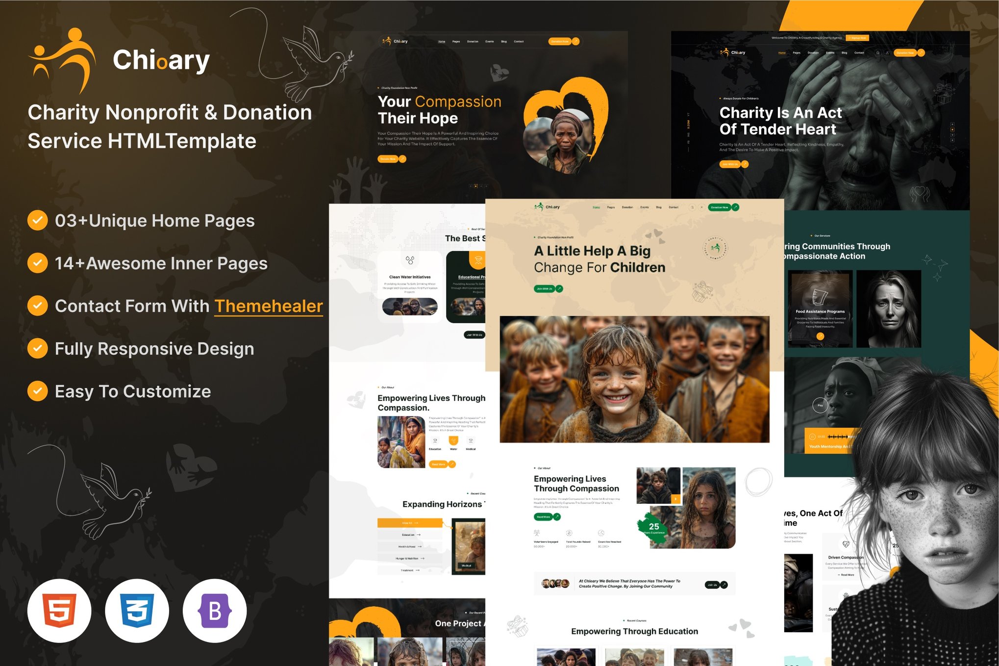 Chioary is a contemporary and sleek Responsive HTML5 template designed for charity, non-profit organizations, and fundraising websites. With three homepage layouts, 20+ valid HTML files, and a responsive design, Chioary offers versatility and ease of customization. The template’s elegant and modern design, along with features such as Owl Carousel Slider and CSS3 animations, ensures a visually appealing and user-friendly experience. Built on Bootstrap 5 Framework, Chioary is SEO optimized, cross-browser compatible, and fully responsive. Easy to modify and well-documented, this template provides everything you need to create a professional and impactful online presence for your cause.
