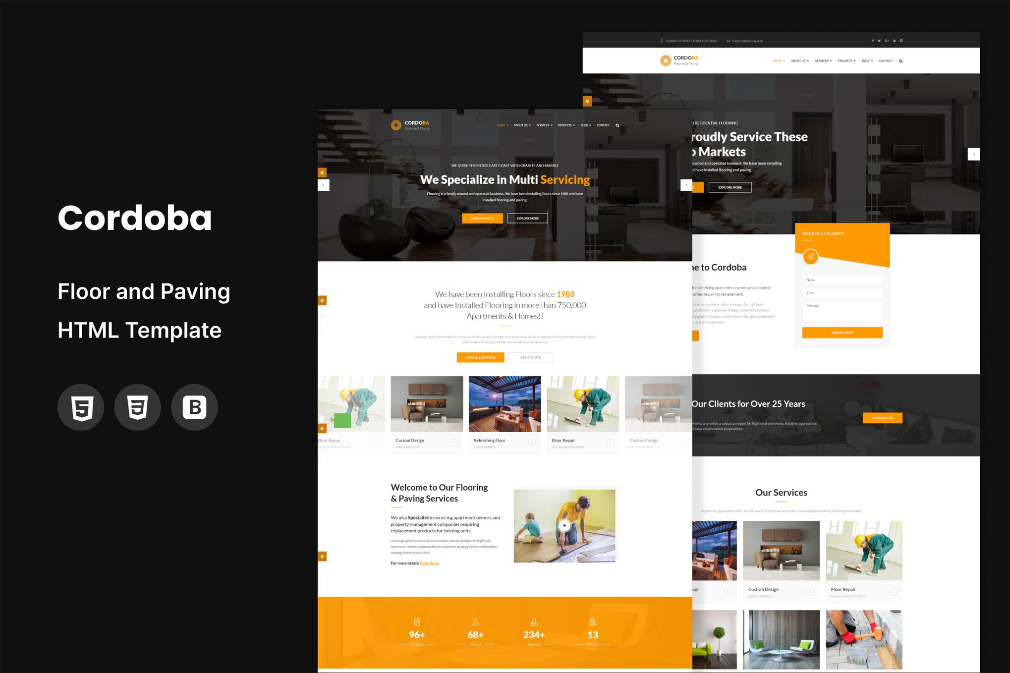 Cordoba is a versatile and robust HTML Template catering to the needs of flooring, paving, and renovation companies. Specifically crafted for floor installation projects including wood, parquet, carpets, and more, this template also covers services such as painting & decorating, kitchen and bathroom renovations, false ceilings, and interior/exterior design solutions. With a focus on precision and elegance, Cordoba provides a comprehensive platform for businesses in the flooring and renovation industry to showcase their expertise and services effectively. Ideal for those seeking a professional and modern online presence.