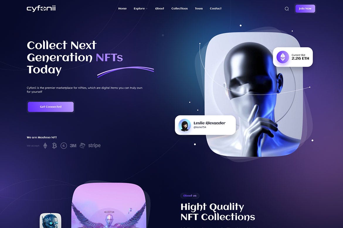 Introducing Cyfonii – the NFT Portfolio React Template designed for traders and creators in the digital marketplace. Connect with collectors and fellow creators to effortlessly trade and exchange non-fungible tokens. With user-friendly features like easy navigation and responsive design for multiple screen sizes, this template offers a seamless experience. Customize your website with personalization options, including a clean and unique design, developer-friendly code, and a range of built-in functionalities to showcase your NFT portfolio effectively. Elevate your online presence with Cyfonii and unlock endless possibilities in the world of NFT trading.