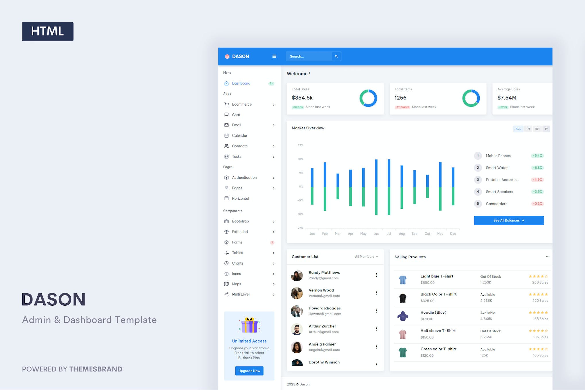Dason – Admin & Dashboard Template is an exceptional tool for creating stunning and efficient admin panels. With a clean and modern design, it offers a wide range of customizable components and layouts, making it perfect for various projects. Its user-friendly interface and extensive documentation make it easy to use and customize.