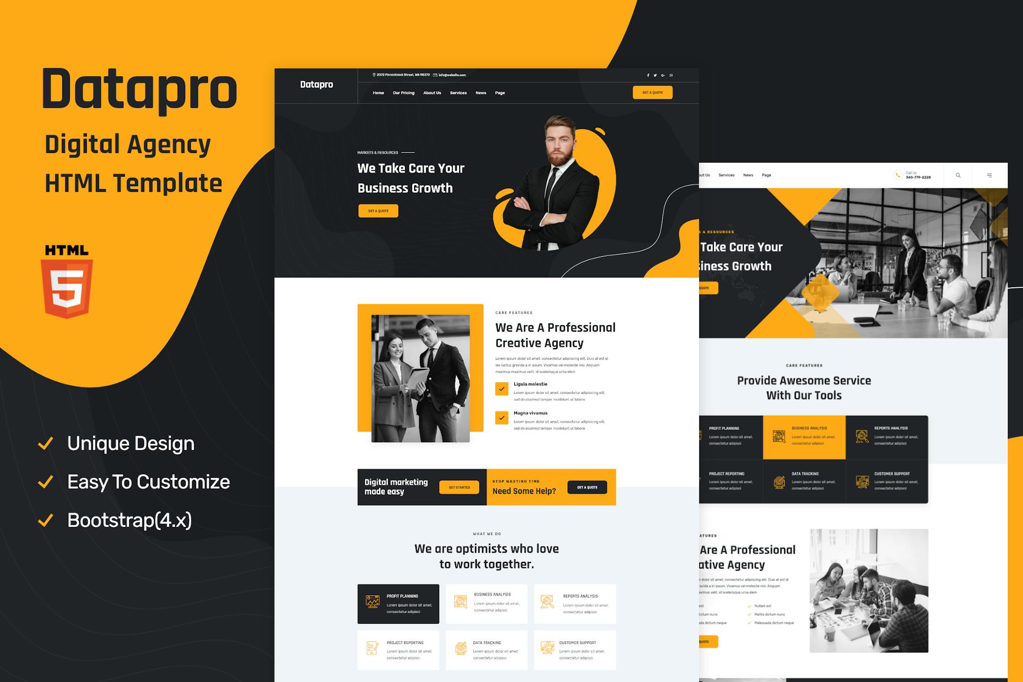 Introducing Datapro – a lightweight and versatile one-page landing page template designed for startups, agencies, and diverse businesses. With a clean, modern HTML design, Datapro is ideal for creating websites for startup corporations, portfolios, service sites, and more. This template boasts two unique homepage versions, W3C validated HTML5 & CSS3 coding, a flat and sleek design, and full responsiveness across all modern browsers and devices. Built with Bootstrap 4, Datapro offers unique effects, a working contact form, and easy customization, making it a perfect choice for your online presence. Kindly note that all images used are for preview purposes only and are not included in the final purchase files.