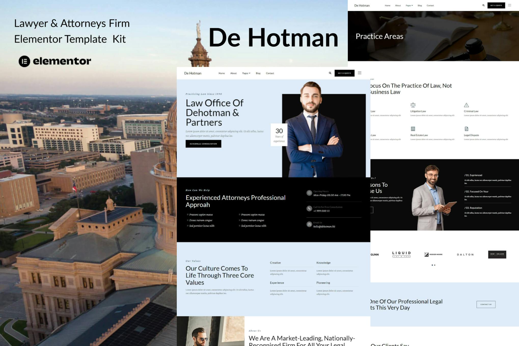 DeHotman is a meticulously crafted Elementor Template Kit designed for law firms, attorneys, and legal professionals, while also catering to business consultants and financial advisers. Featuring a sleek, modern, and responsive design, DeHotman includes 14 stunning templates for pages like Home, About, Practice Areas, Attorneys, and more. With Elementor Pro required, this kit offers clean, professional, and unique design elements, Google Fonts integration, and easy customization. Simple to use with its drag-and-drop functionality, DeHotman is a versatile choice for creating a professional online presence. Explore its features and elevate your website with DeHotman Template Kit.