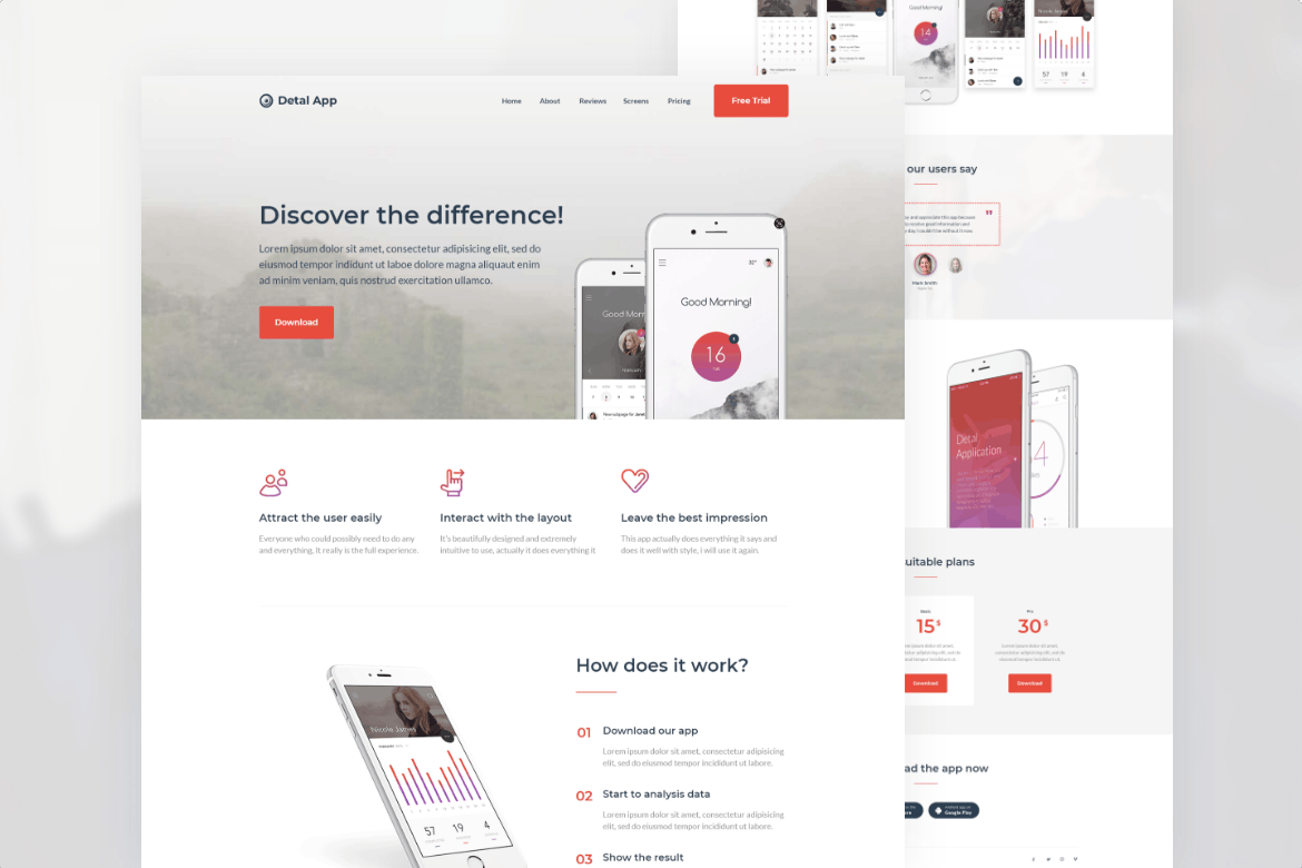Detalapp is an App Unbounce Landing Page Template designed to enhance your app promotion efforts. With features such as a parallax background, drag and drop page builder, and a responsive layout, Detalapp helps your project stand out effortlessly. The template is optimized to save your time and money while providing a seamless customization experience to suit your business needs. Notable features include a working Mailchimp subscribe form, unique CSS animation effects, and modern design elements. Additionally, Detalapp comes with detailed documentation for easy setup and operation.