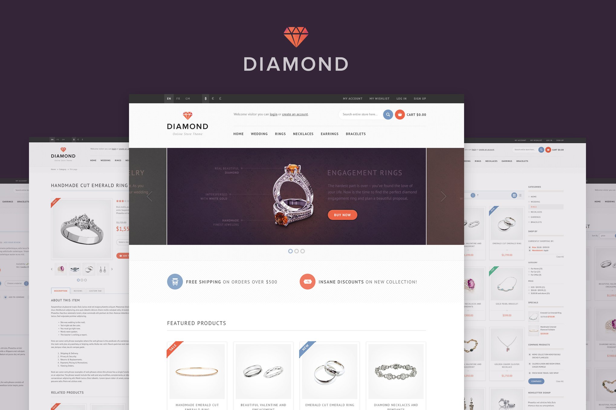 The «Diamond» Magento store template is designed in a vintage style, offering a high-quality solution for online businesses. With its thoughtful and carefully elaborated design, «Diamond» is sure to captivate users and drive conversions. This theme is 100% compatible with Magento Community Edition 1.8.x and comes with a range of features such as full responsiveness, touchscreen retina display support, color customization, and badges for new and discounted products.