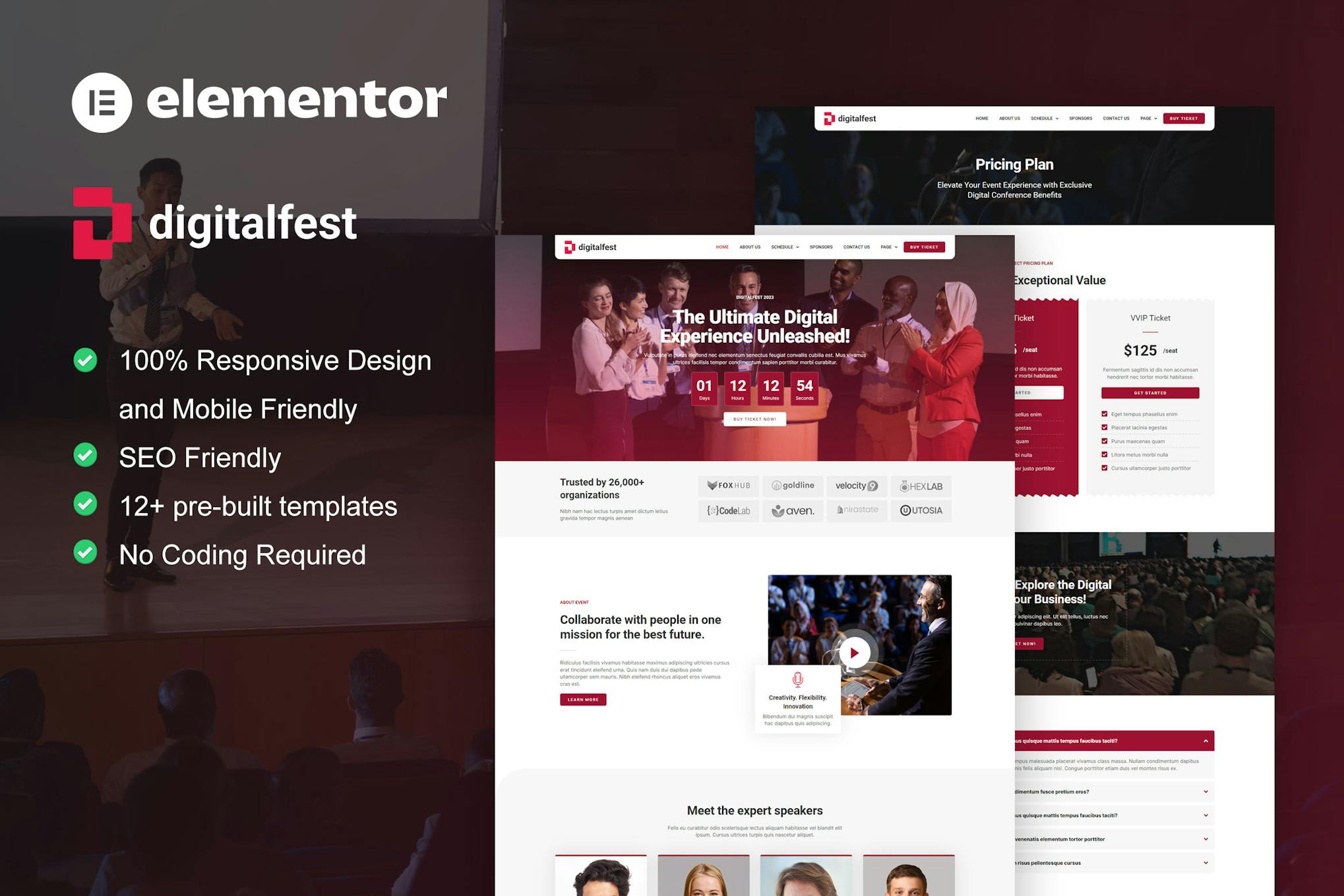 Elevate your event and conference website with DigitalFest, an Elementor Pro Template Kit featuring a modern, sleek, and professional design. Perfect for businesses and services in the event and conference industry, this kit allows you to effortlessly create a standout website to promote various gatherings such as seminars, webinars, concerts, and more. With its user-friendly drag-and-drop interface, no coding is required, saving you valuable time in crafting a polished online presence. Enjoy the flexibility of customizing 12+ pre-built templates, ensuring a responsive and mobile-friendly experience for your visitors. Streamline your website development process with this Elementor Template Kit and showcase your events with style and ease.