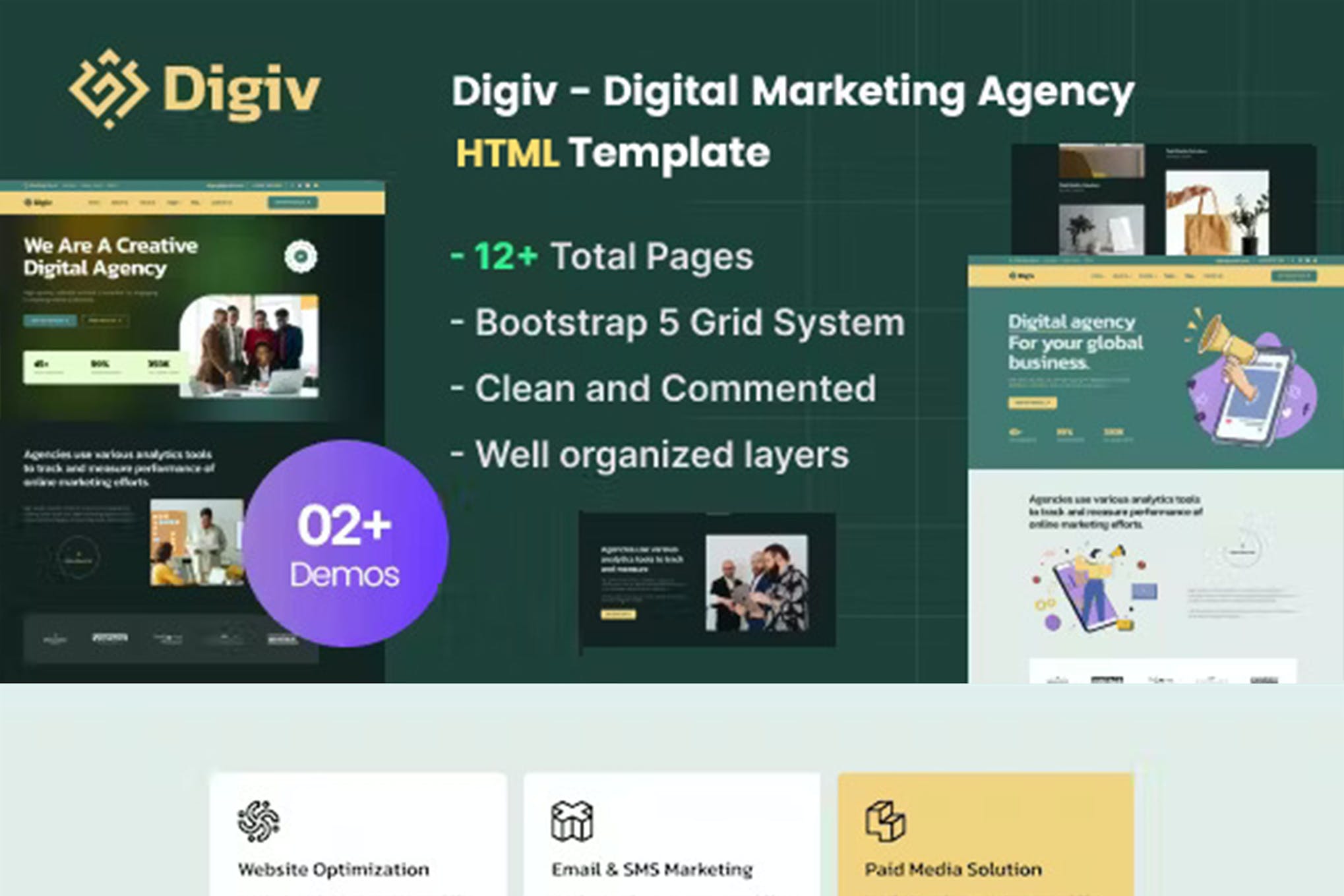 Enhance your digital presence with Digiv, a premium Digital Marketing Agency HTML Template. With its modern design and unique style, Digiv is perfect for high-level business websites, marketing agencies, SEO services, and more. This responsive template, built with Bootstrap, features clean code, SEO optimization, and fast loading times. Take advantage of its 12+ pages, including service listings, portfolio showcases, blog sections, and a contact form for seamless customization. Elevate your online strategy with Digiv and experience professional design at your fingertips.