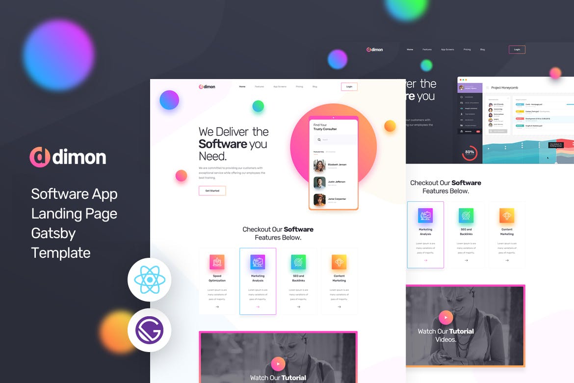 Dimon – Gatsby React App Landing Page Template is a visually stunning and highly functional template designed for showcasing and promoting your mobile or web application. With its modern design, smooth animations, and responsive layout, it provides a seamless user experience. Its customizable components and easy-to-use code make it a perfect choice for developers and businesses alike.