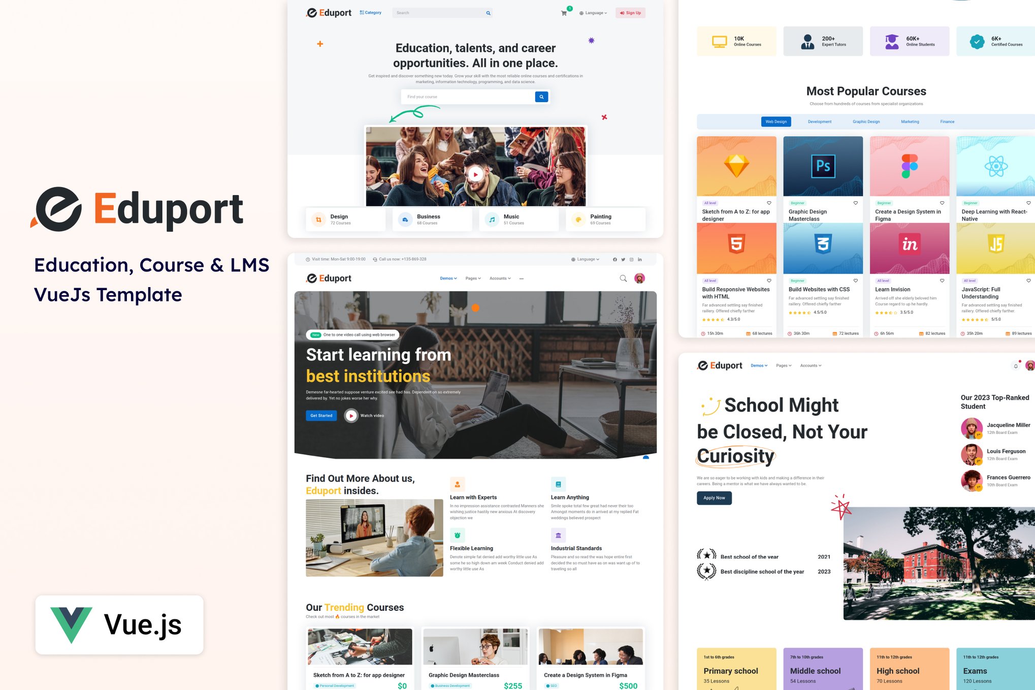 Eduport – Vue LMS is a comprehensive education and course template designed for various educational institutions. It offers a range of features from minimal to advanced designs to cater to different requirements, making it suitable for creating websites dedicated to education.