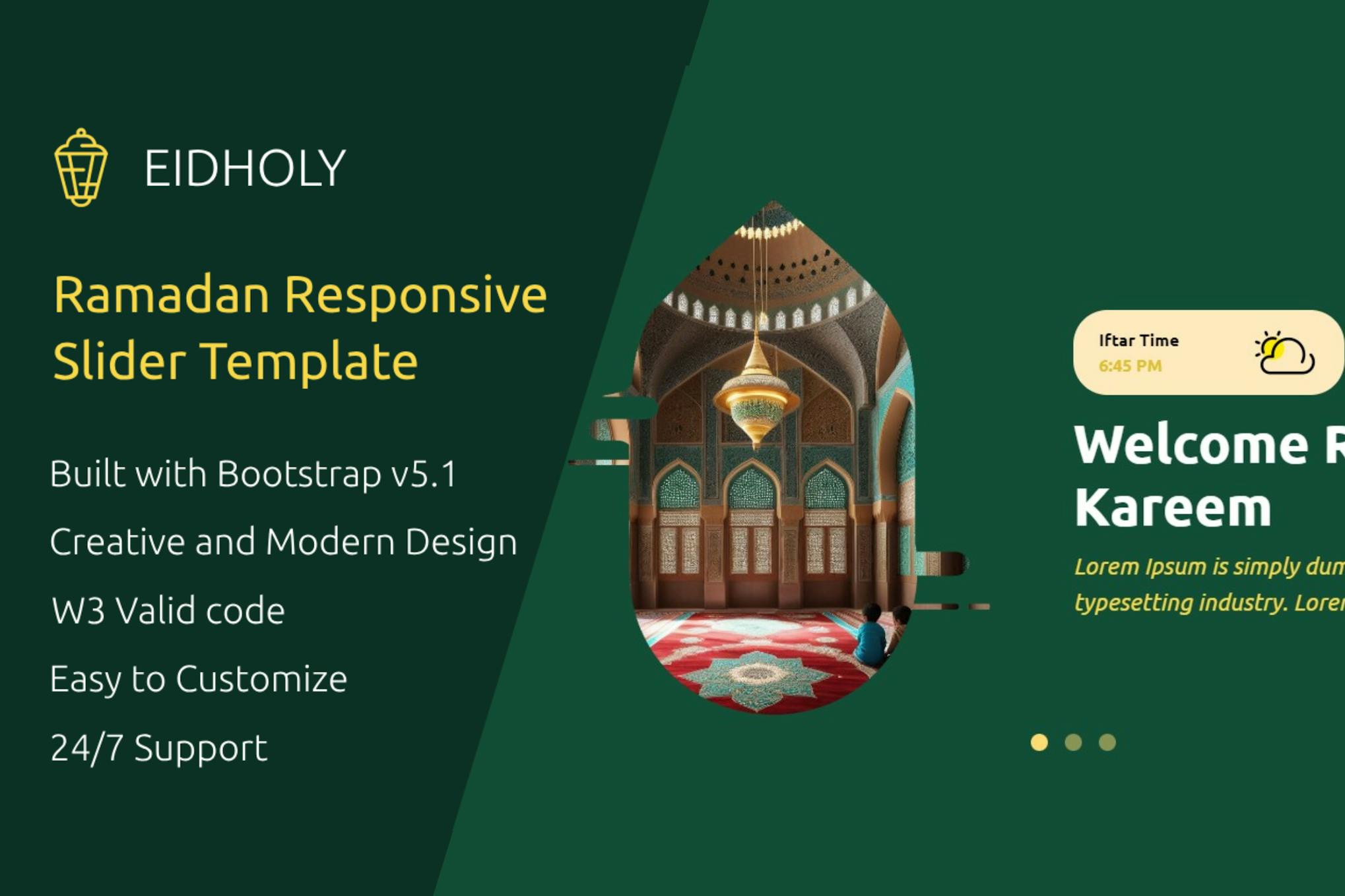 EidHoly Slider is a comprehensive package that offers a unique blend of style and functionality, tailored for Ramadan and Eid celebrations. This responsive Bootstrap v5 template features customizable sliders to help you craft dynamic and engaging web pages effortlessly. With EidHoly Slider, you can easily enhance your website with stunning sliders that work seamlessly across all devices, providing a visually appealing experience for your audience. Choose from various transition effects, control animations, and personalize everything from colors to fonts to create the perfect slider for your site.