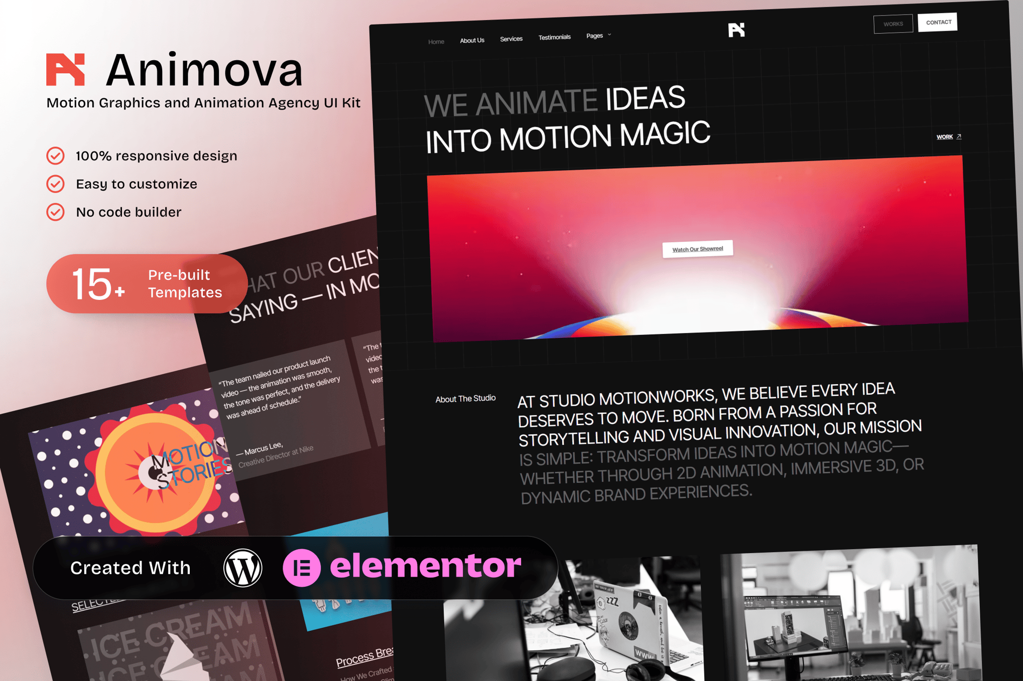 Elevate your animation studio’s online presence with Animova, a meticulously crafted Elementor Template Kit designed for motion graphics and animation agencies. Showcase your creative work, explainer videos, studio reel, process, and client testimonials with this sleek, fully responsive kit. Featuring 15+ page templates and seamless customization using Elementor, Animova is optimized for SEO and lead generation, ensuring your agency stands out as both professional and creative in the competitive animation industry.