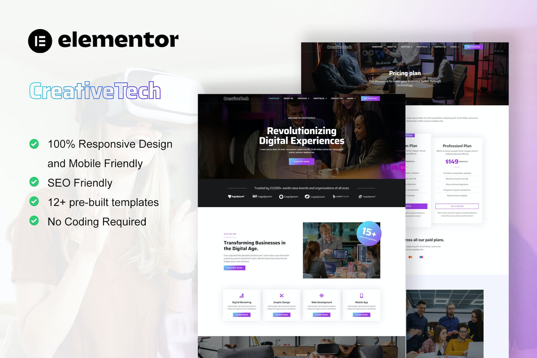 Introducing CreativeTech, the ultimate Elementor template kit for digital marketing agencies. With its 12+ pre-built templates, this kit offers a cool and modern design that can be easily customized for any type of business or service. Whether you’re a graphic designer, web developer, or SEO specialist, CreativeTech has got you covered. Save time and effort with Elementor Page Builder, as you can edit and customize this kit without any coding skills. Get ready to elevate your digital marketing agency website to new levels of creativity and professionalism.