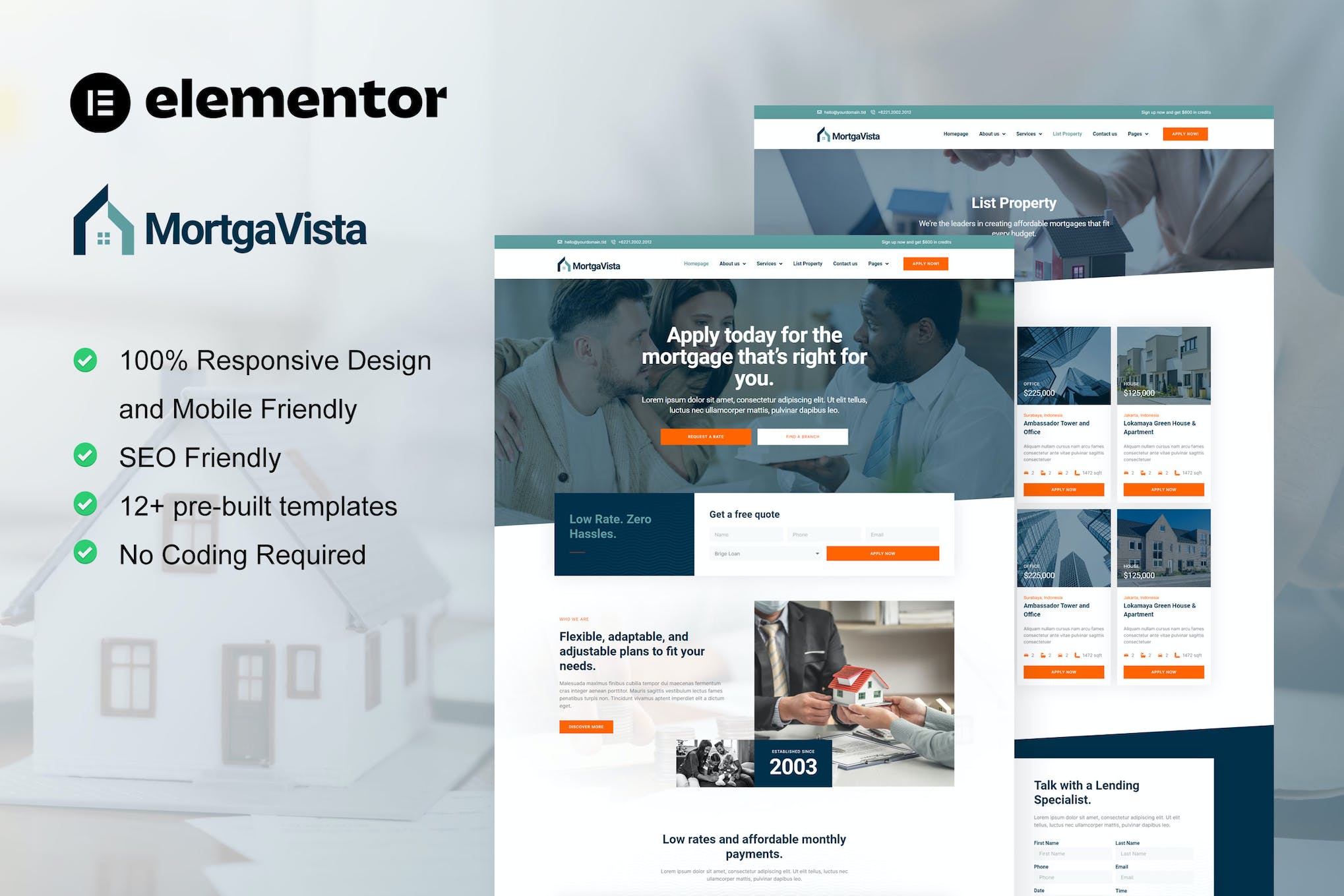 Introducing Mortgavista, an impressive Elementor Pro template kit designed specifically for mortgage firms, property agents, and apartment agencies. With its 12+ pre-built templates featuring sleek designs and modern styles, this kit allows you to effortlessly create a stunning website. Save valuable time with Elementor Page Builder, as no coding is required – simply drag and drop elements to customize your site. Whether you’re a beginner or a seasoned professional, Mortgavista’s user-friendly interface and extensive layout features make it the perfect choice for showcasing your mortgage services. Get started today and bring your mortgage firm website to life with Mortgavista.