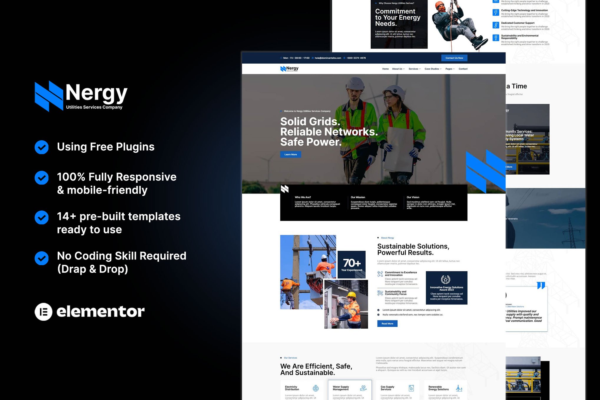 Enhance your utilities services website with Nergy, a modern Elementor Template Kit designed for Utilities Companies, Consultants, and Business Services. This kit offers 17+ pre-built templates that are fully responsive and easy to customize without any coding required. Utilize features like customized fonts and colors in one place, along with addons like Elementor and ElementsKit Lite for a seamless website-building experience. Save time and create a professional website effortlessly with Nergy Template Kit.