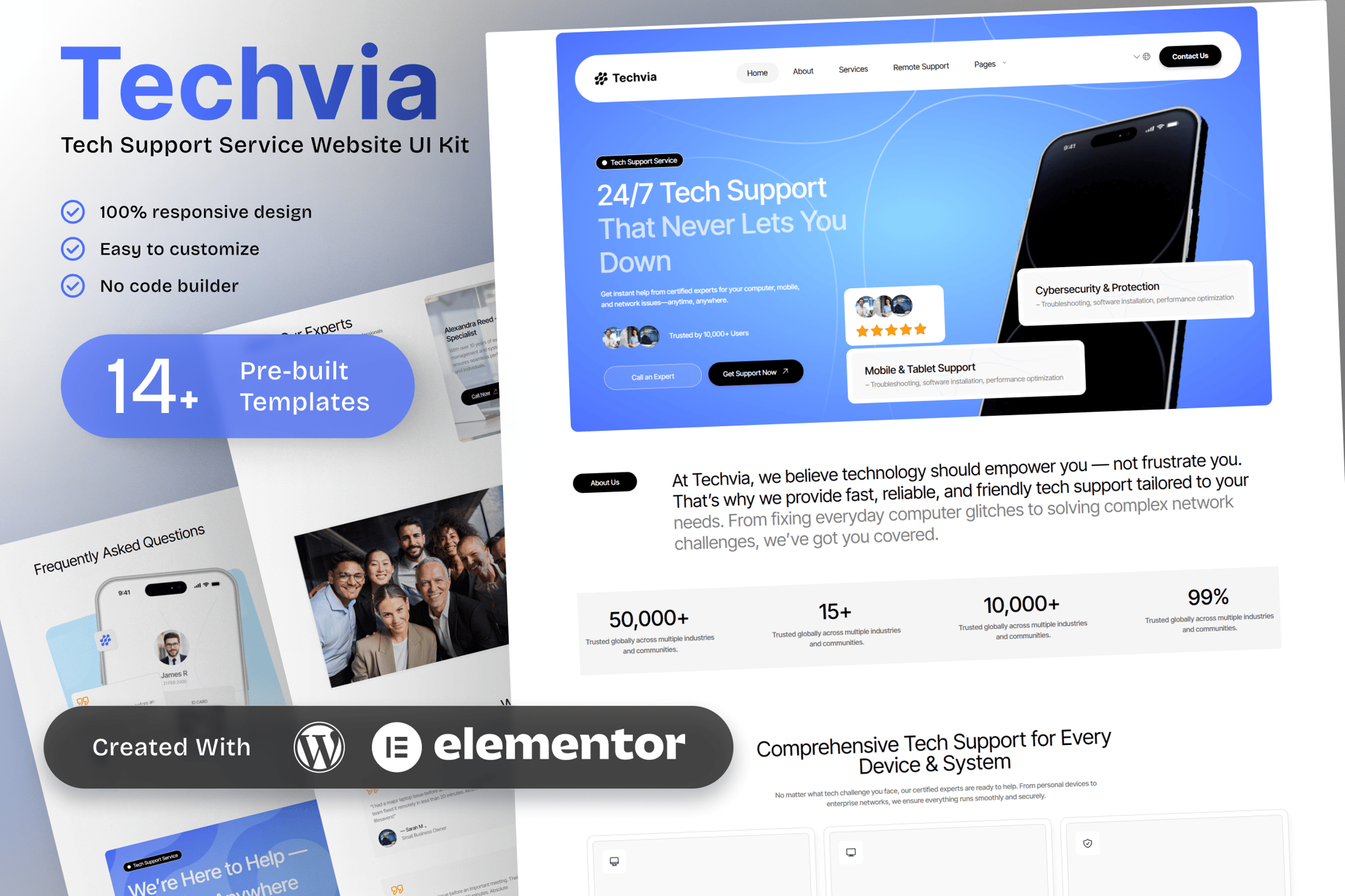 Techvia is a modern Elementor Template Kit designed for IT support companies, computer repair services, and cybersecurity providers. With a professional and clean layout, Techvia enables you to showcase remote support, device repair, and cybersecurity solutions effectively. Featuring 14+ ready-to-use page templates, Techvia is easily customizable with Elementor, optimized for SEO, and fully responsive. Perfect for IT consulting firms and computer repair shops, Techvia helps attract clients, offer seamless online support, and establish expertise with ease.