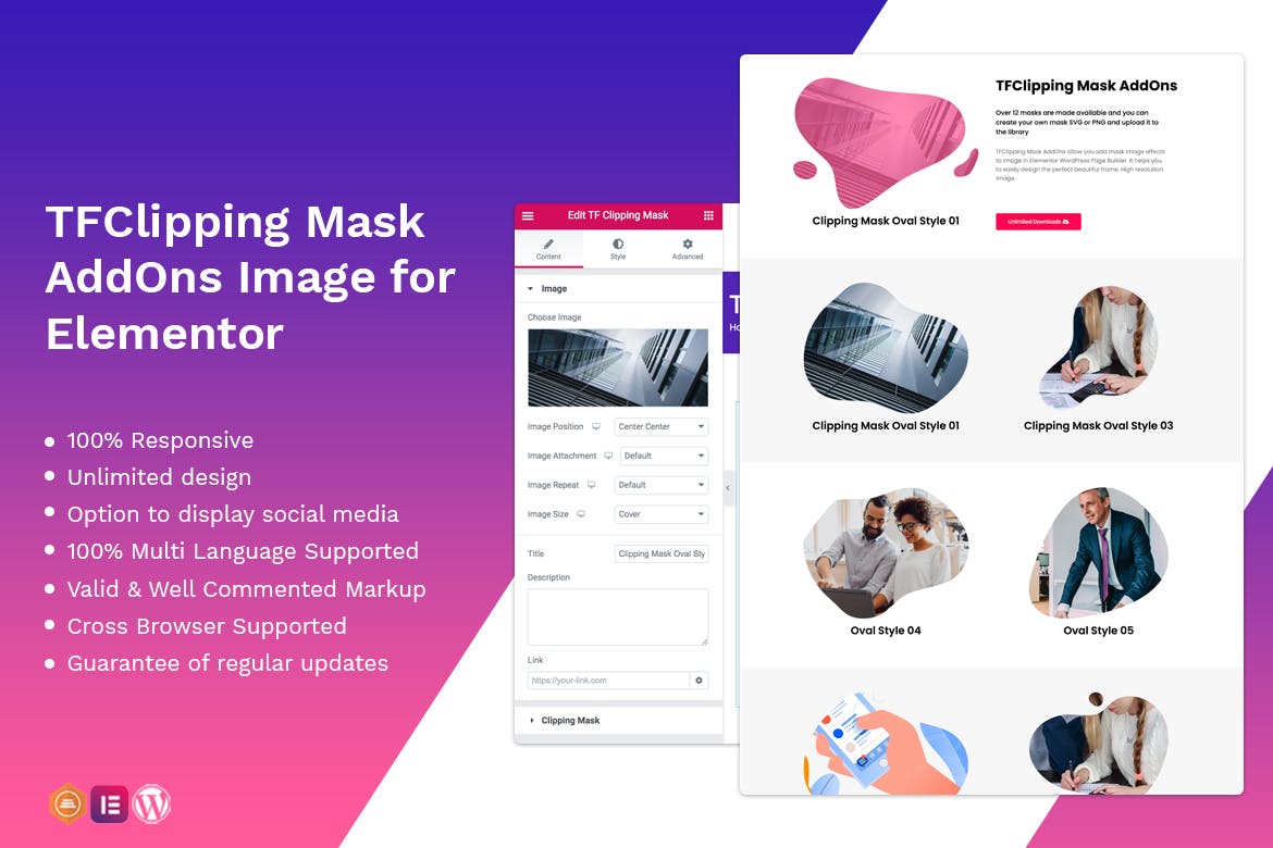 Introducing TFClipping Mask AddOns, the perfect tool for enhancing your images in Elementor WordPress Page Builder. With over 12 pre-made masks available and the ability to upload your own custom SVG or PNG masks, you can easily create stunning and unique designs. This add-on is 100% responsive, multi-language supported, and compatible with Elementor. Plus, enjoy regular updates to ensure your experience is always up-to-date. Take your image design to the next level with TFClipping Mask AddOns.