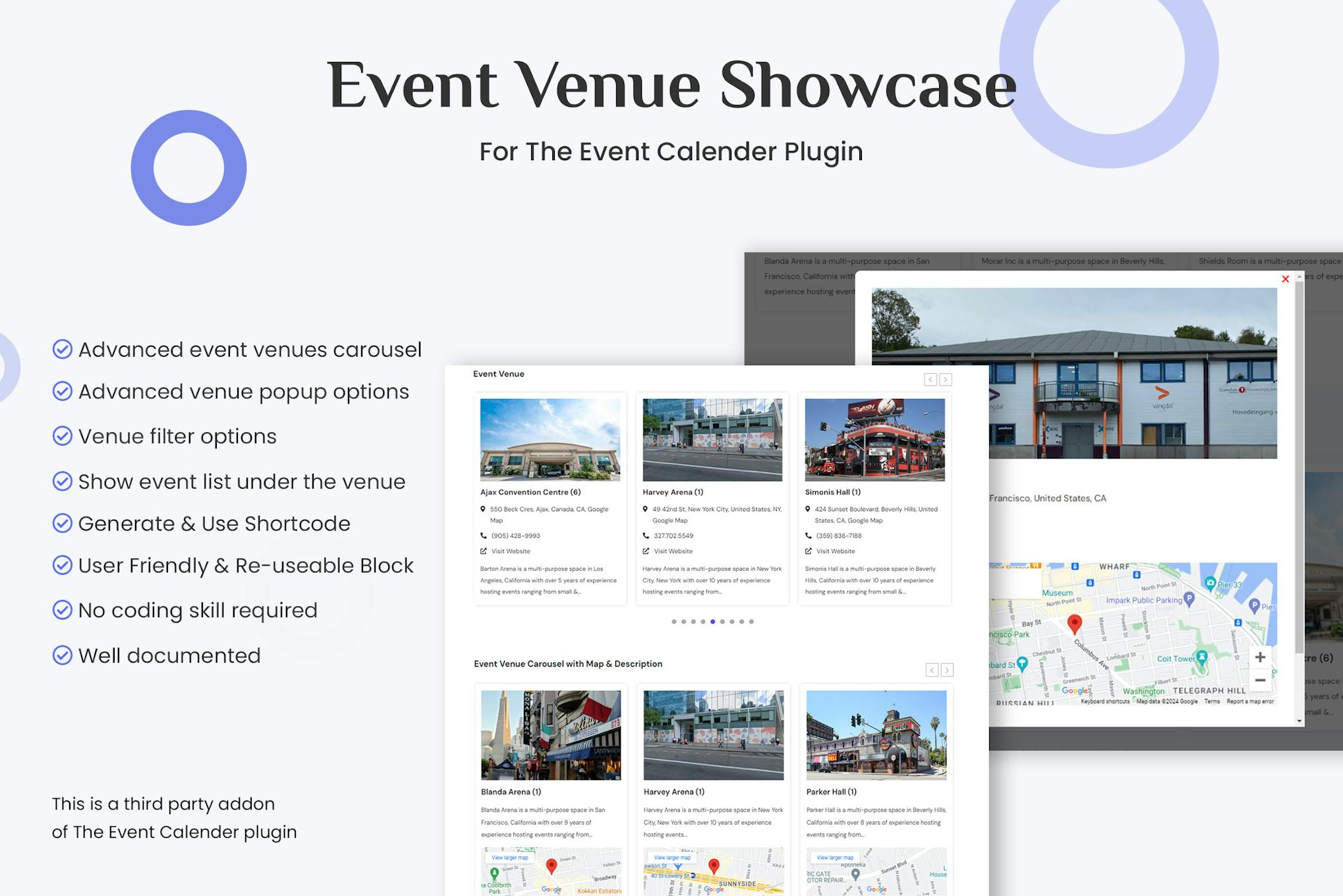 The Event Venue Showcase addon for The Event Calendar plugin allows you to creatively display event venues in a carousel format. Easily showcase venue details like images, titles, addresses, and more on your site using a shortcode. This plugin offers an enhanced popup feature for additional venue information, without requiring The Events Calendar Pro version. You can customize the design, order venues, and even add event details within the popup. With device-responsive controls, customizable styling, and SEO optimization, this plugin is user-friendly and robust for showcasing event venues effectively.