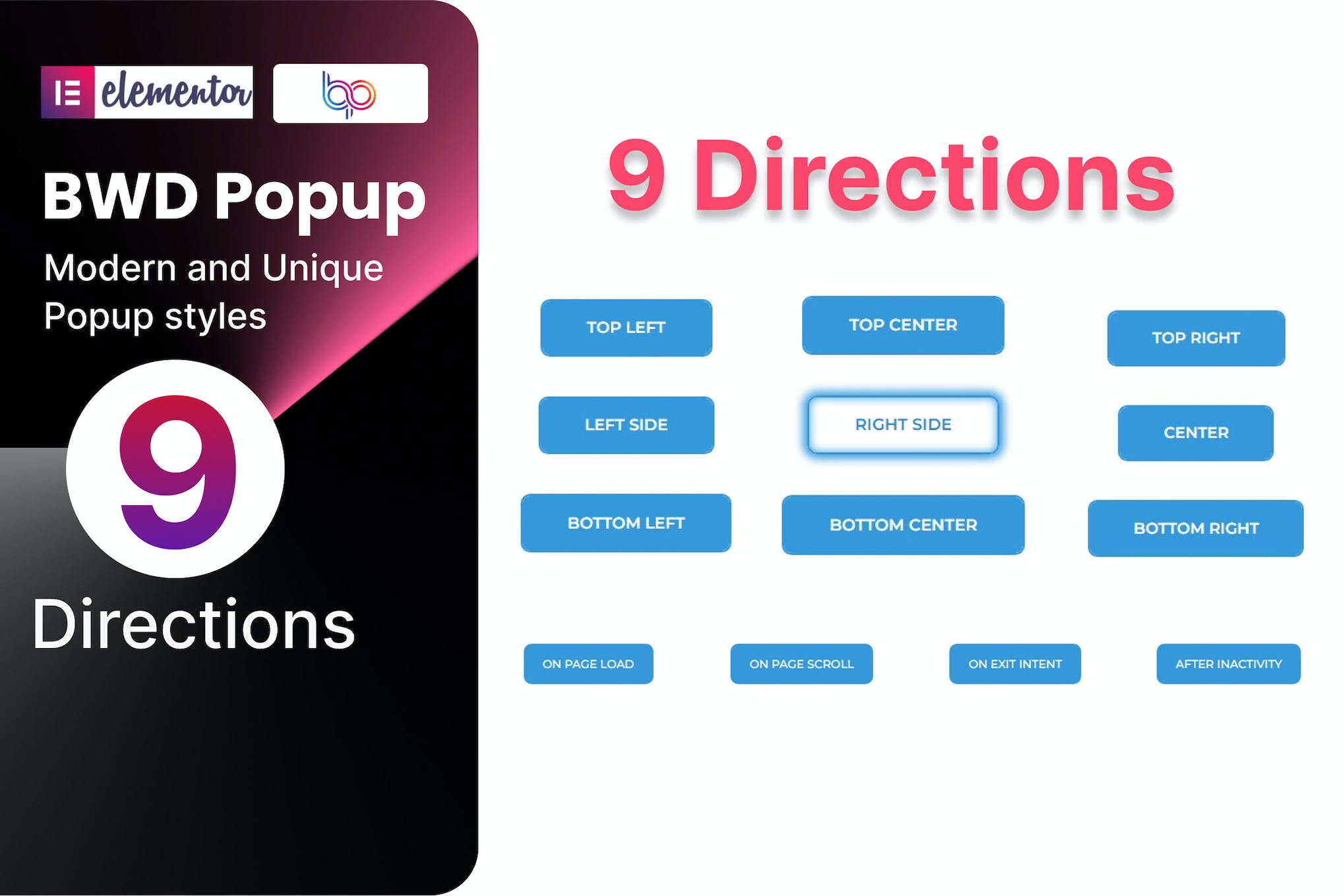 Introducing BWD Popup, a lightweight WordPress plugin designed for Elementor users. With 9 available directions and 4 conditional display options, you can easily add attractive popups to your website without any coding knowledge. This plugin offers easy customization, allowing you to create unique popups within minutes. It is responsive, SEO friendly, and works seamlessly with Elementor 2.5 and higher. The clean and optimized code ensures cross-browser compatibility and W3C standards compliance, making it a perfect choice for all WordPress themes built on Elementor.