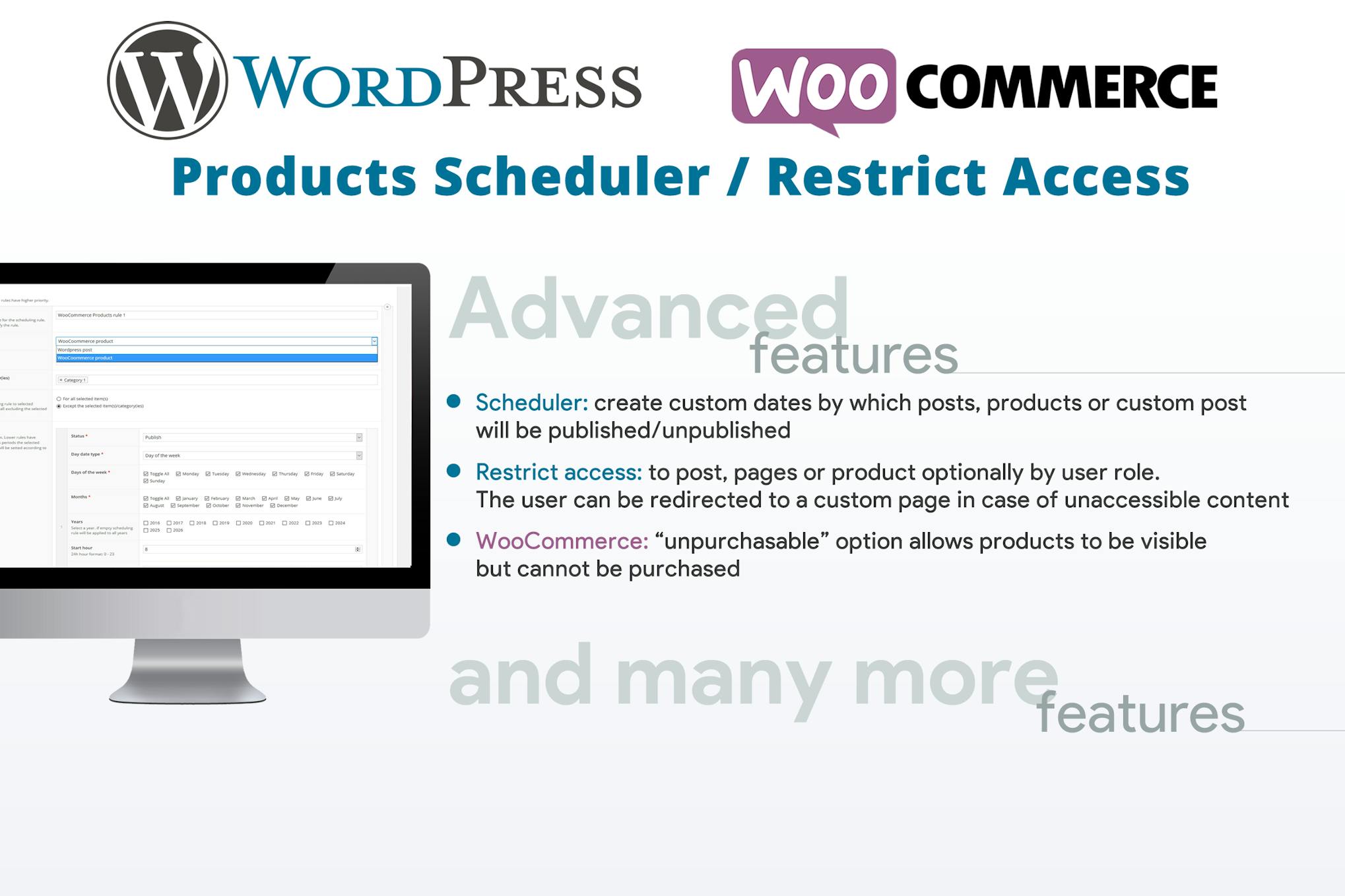 The WordPress Posts & WooCommerce Products Restrict Access/Scheduler (WPPS) plugin allows site admins to schedule or restrict access to posts, custom posts, and products by date rules and user roles. It includes the option to set WooCommerce products as Unpurchasable, making them visible but not purchasable. Shop admins can configure scheduling rules for automatic post publishing/unpublishing and access restriction by user roles, with the ability to redirect to a specific page for restricted users. Additionally, products can be set as Unpurchasable with the add-to-cart button removed, and admins can choose whether the product should be available for purchase or unpublished before and after the Unpurchasable period.