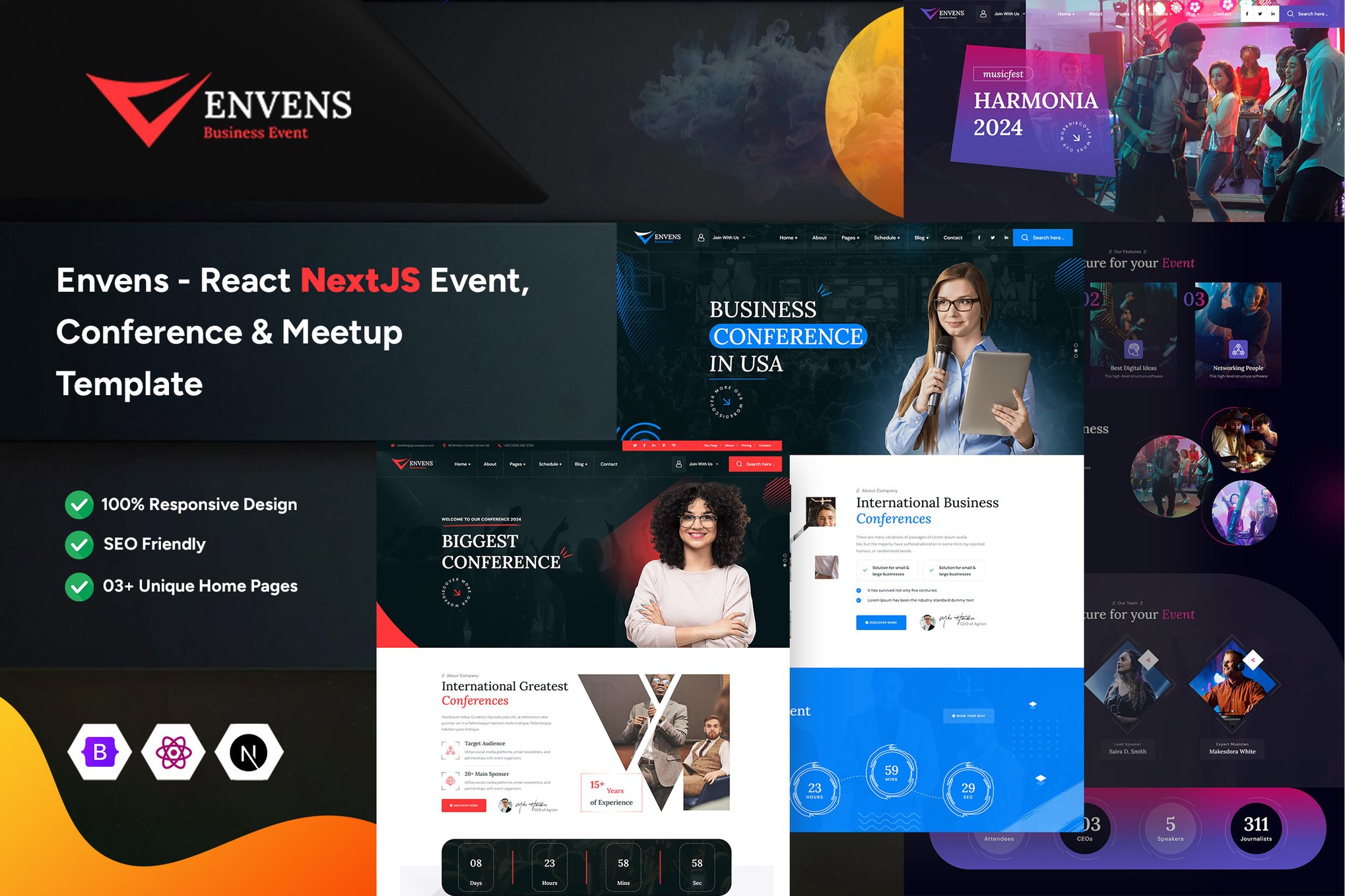 The Envens React NextJS Template is a cutting-edge solution designed for various event-oriented websites such as conferences, meetups, seminars, and more. With a sleek and modern design, it offers 03 home versions and 25 inner pages, ensuring a comprehensive user experience. Built with React, Next.js, and Bootstrap 5, this template is developer-friendly, lightweight, and responsive on all devices. It features CSS3 animations, SEO-optimized code, cross-browser compatibility, and W3 validation. Fully customizable with detailed documentation and a supportive team, Envens is the perfect choice for creating dynamic and engaging event management websites.