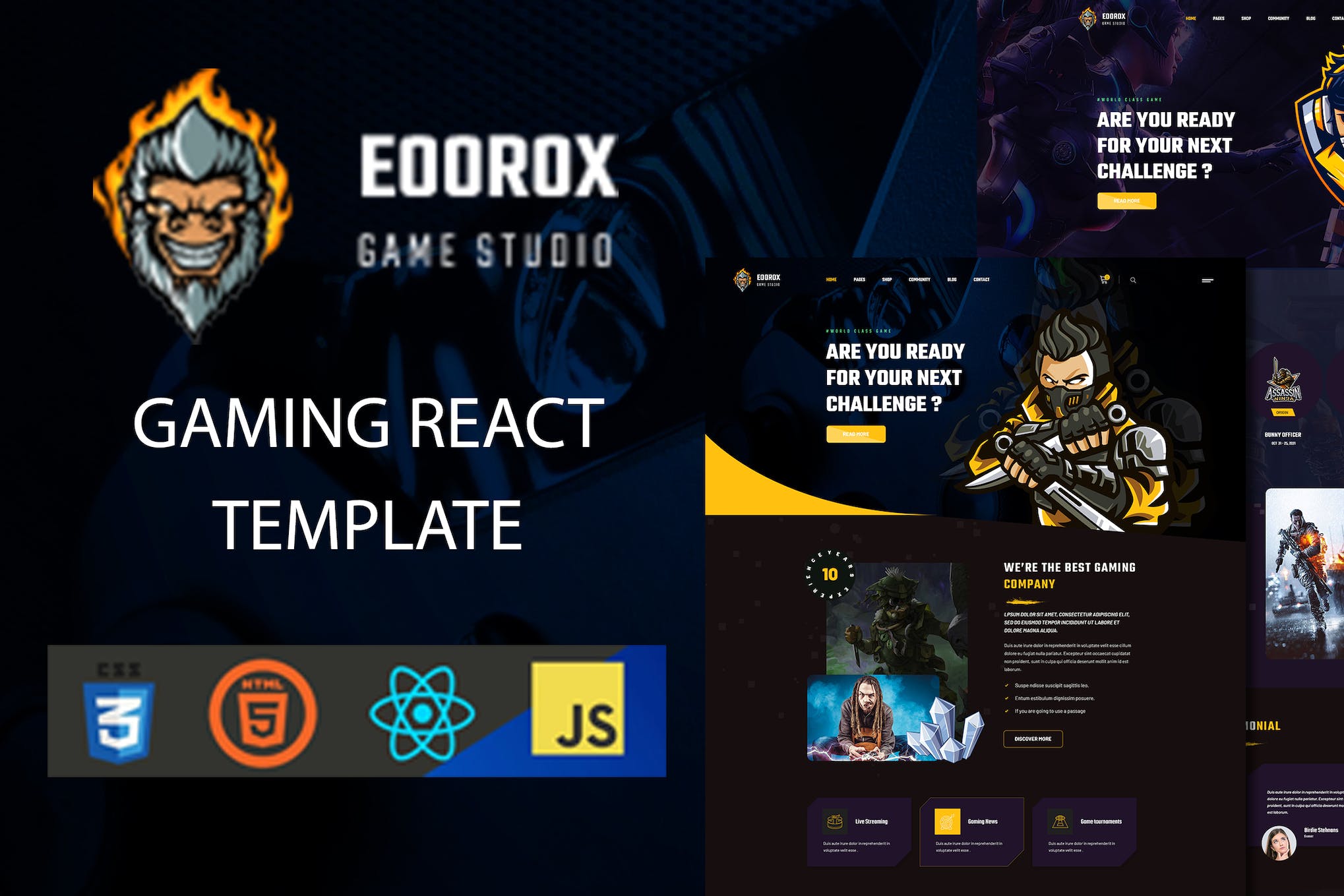 Eoorox- React Gaming and eSports Template is a cutting-edge solution tailored for game portals, eSports platforms, gaming studios, and more. With its three unique Home page variations, this template offers a dynamic and professional design to showcase your games, streams, clan information, and more. Built with React v17.0.2, Bootstrap 4, and featuring API-based components, Eoorox ensures a seamless browsing experience across all devices. Its clean layout, CSS3 animations, and strong client support make it a top choice for creating modern and engaging gaming websites. Additionally, it comes with a range of essential pages such as About Team, Gallery, FAQ, Blogs, and Contact to meet all the requirements of a gaming-oriented site.