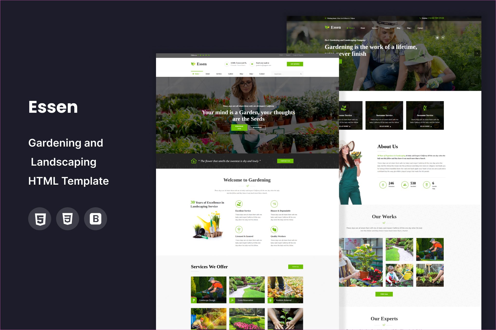 Essen Gardening and Landscaping HTML Template is the ideal solution for Gardening, Landscaping Companies, and related services. Perfect for businesses offering Gardening services, the template features a unique design tailored for online presence. Its 100% responsive design ensures compatibility with all major handheld devices. Packed with essential features such as project showcases, blog integration, testimonials, and team profiles, Garden Plants template delivers a seamless user experience. With its visually appealing design and functionality, Garden Plants is the ultimate choice for launching or revamping your company website.
