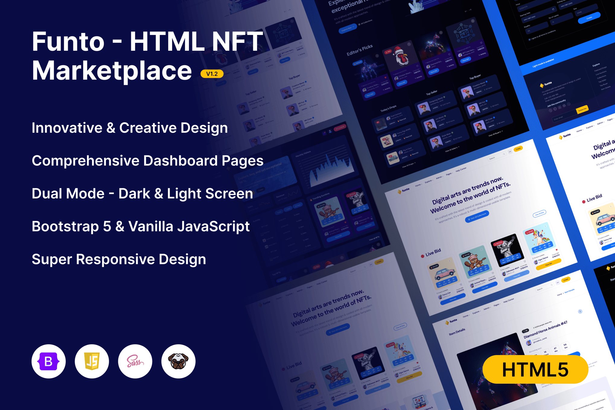 Introducing Funto – a cutting-edge HTML NFT marketplace template that embodies the latest design trends and modern coding practices. This SEO-friendly and easily customizable template is ideal for NFT marketplaces, digital collectibles, and art websites. With its responsive design and robust features, Funto ensures seamless performance across various devices. Leveraging technologies like Bootstrap 5.2+, Sass, and Vanilla JavaScript, it offers a smooth user experience without jQuery dependency. Packed with versatile features such as light and dark mode options, multiple homepage variations, an admin page, 35+ fully featured pages, and more, Funto stands out as a comprehensive solution for creating dynamic and engaging online marketplaces.
