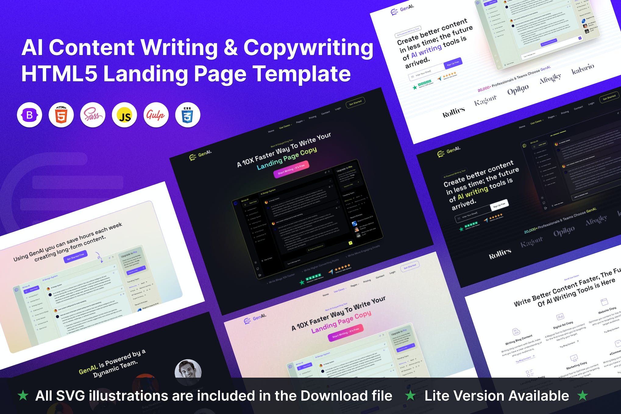 Introducing GenAI – AI Content Writing & Copywriting HTML5 Landing Page Template, designed for Content Marketers, Digital Marketing Agencies, and Tech Entrepreneurs looking to create a professional online presence. This template offers over 26 pages and 50+ modern UI components, including two home page variations, case pages, pricing options, and more. GenAI is fully responsive, ensuring a seamless user experience across all devices. Built with Bootstrap 5 and other modern technologies, this template allows for easy customization and presents a clean and creative design. Elevate your business with GenAI and captivate users with its unique UI and UX.
