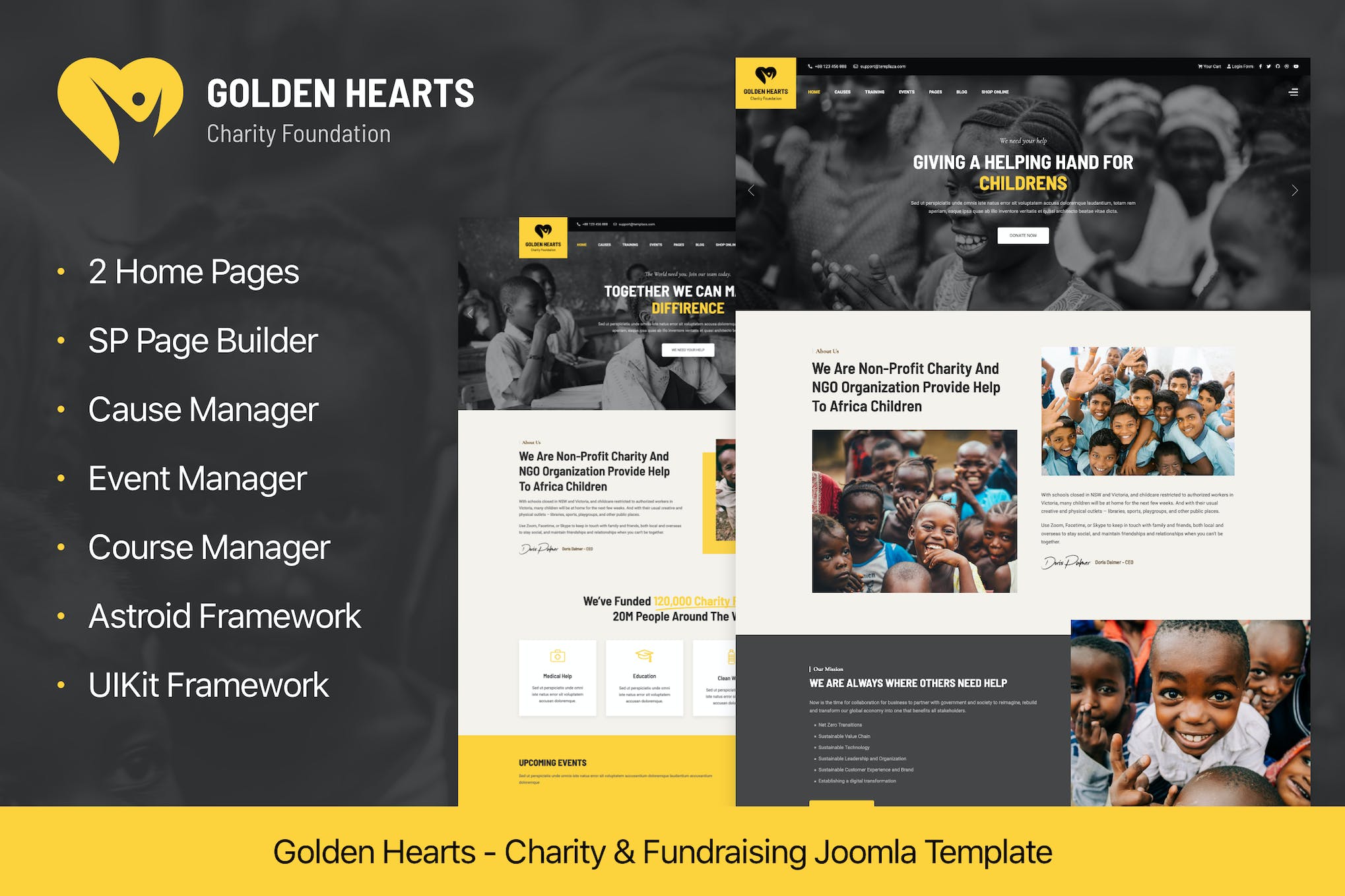 Golden Hearts is a highly adaptable and visually appealing theme specifically designed to create a professional online platform for NGOs, charity events, and campaigns. With its responsive design and compatibility with Joomla 3.10.x & Joomla 4, this theme provides a solid foundation for promoting your organization and spreading awareness for your cause. Featuring a powerful Astroid Framework and integration with SP Page Builder Pro, you can easily customize your website using the drag and drop layout builder. Additionally, the inclusion of Hikashop, TZ Portfolio+ Pro, and Mega Menu Support enhance the functionality of your site, making it an efficient and impactful tool for your organization.