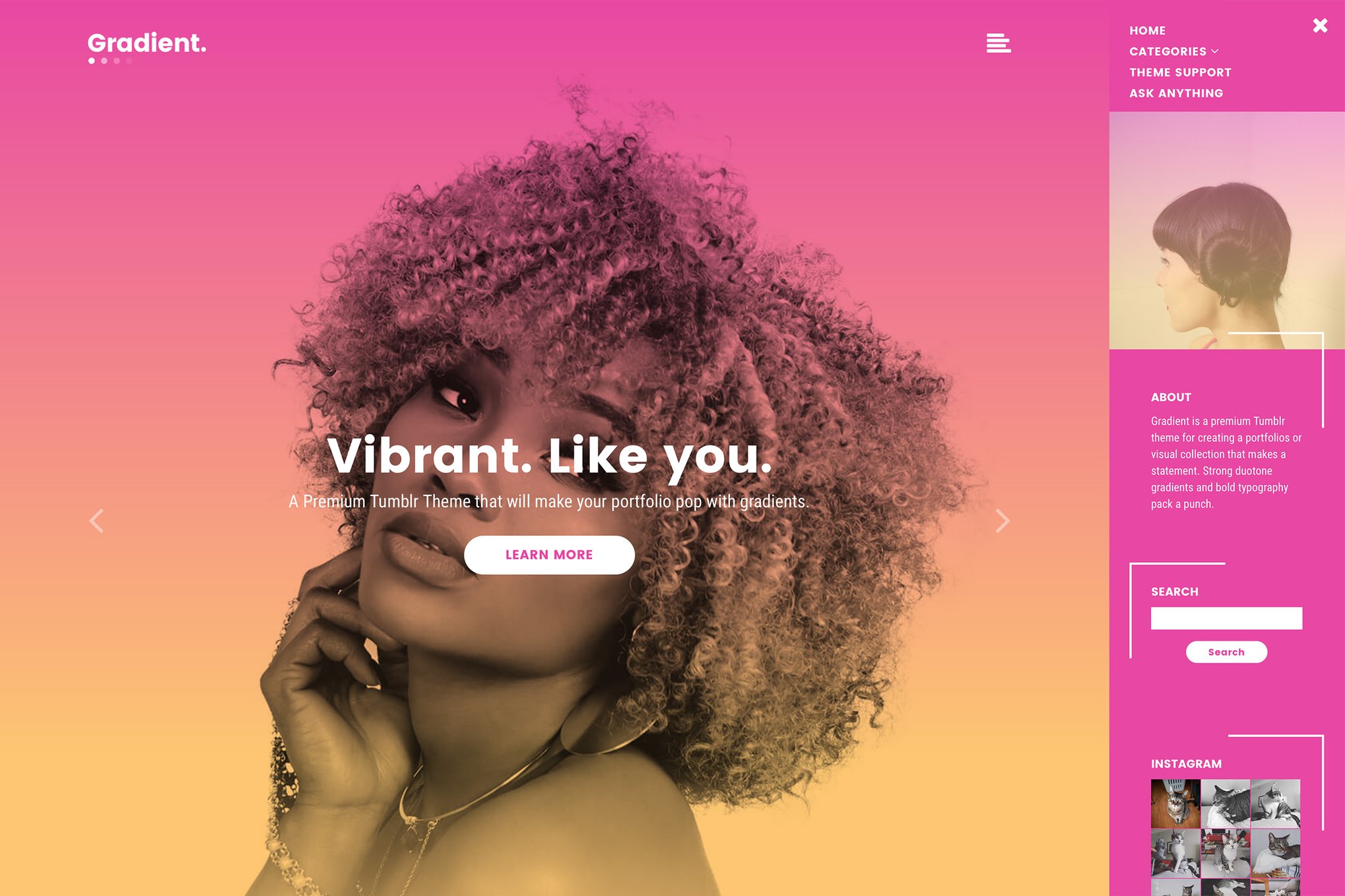 Elevate your Tumblr presence with Gradient the dynamic and lively portfolio theme by Themelantic. Effortlessly create a stunning and uniquely colorful blog that truly reflects your style. Embrace the freedom of customization with Gradient’s impressive features, including a customizable gradient background, a sleek slider for featured images and links, and convenient widgets for Instagram, Twitter, Dribbble, and Flickr. The masonry grid layout ensures a visually appealing display, while the keyboard navigation feature offers a seamless browsing experience. Let Gradient help you craft a vibrant and engaging online presence today! Explore all the exciting features at themelantic.com/gradient and enjoy outstanding support whenever you need it.