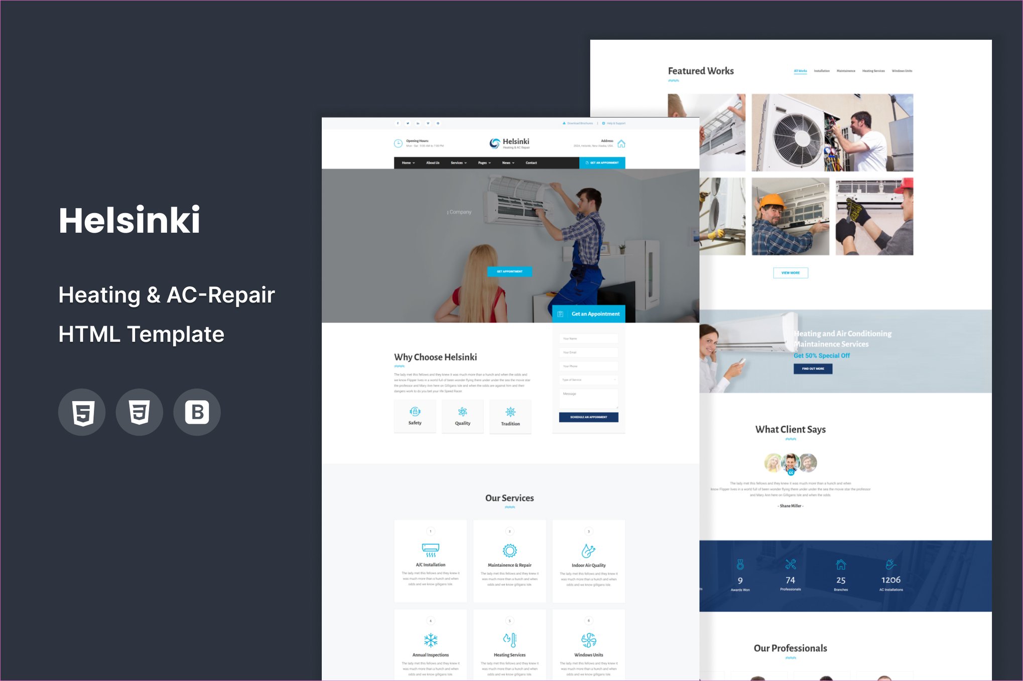 Introducing Helsinki, the sleek and modern HTML template designed specifically for air conditioning and heating service companies, installation services, and air appliance repair centers. A professionally crafted website is essential for any modern business, and Helsinki offers a time and cost-effective solution for creating a niche website. The template features a full-width slider on the homepage, along with text blocks and other key sections to showcase your offerings. Display your products and services on the shop and gallery pages, while sharing success stories on the integrated blog page. Helsinki is the perfect tool to boost your online presence and attract potential clients effortlessly.