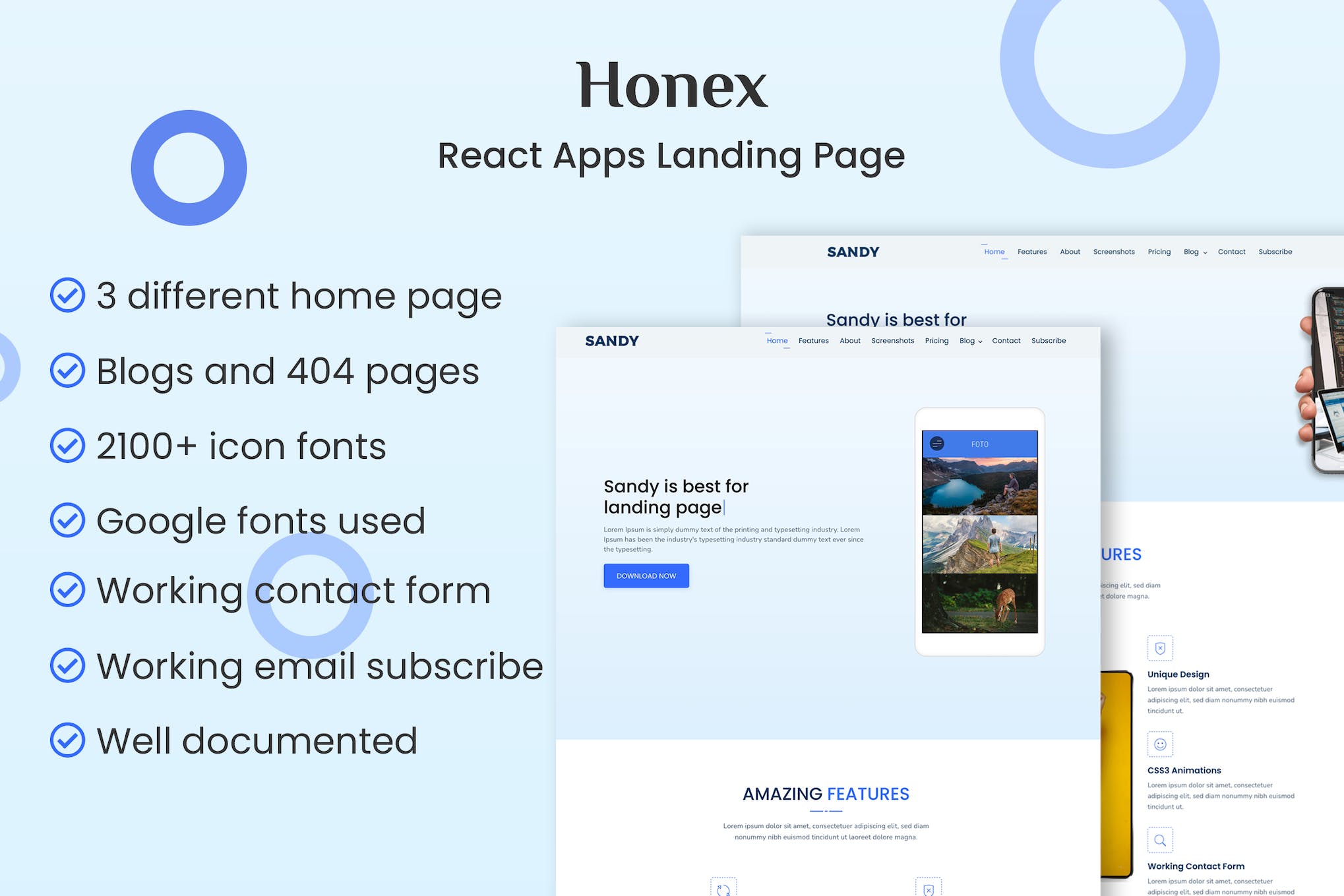 Introducing HONEX – a sleek and modern React Apps Landing Page designed for promoting various digital products with sophistication. Crafted with the latest React and Bootstrap CSS framework, this template offers a responsive layout for seamless viewing across all devices. Boasting a unique design and a plethora of features, including multiple color versions, Google Fonts integration, and smooth CSS3 animations, HONEX is not just an app promotion tool but a versatile showcase platform suitable for diverse purposes. With its user-friendly customization options and meticulous attention to detail, this landing page is tailored for those seeking a professional and captivating online presence.