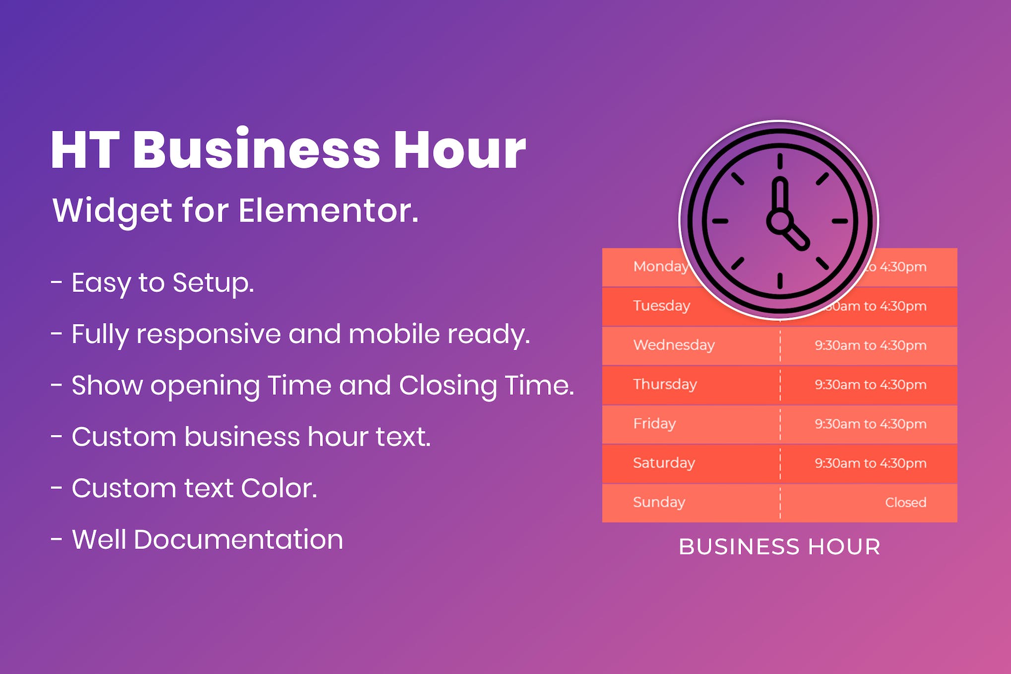 The HT Business Hour Widget for Elementor is a top-notch plugin designed to showcase your business hours on your WordPress website. With its drag and drop setting panel, you can easily customize the plugin with 5+ different styles, creating a unique and impressive business hour display. Fully customizable via Elementor options, you have full control over color style, font size, font family, image layout, and more. This lightweight plugin is also packed with features like custom time separators, display of closed days, highlighting the current day, and well-documented instructions for easy setup.