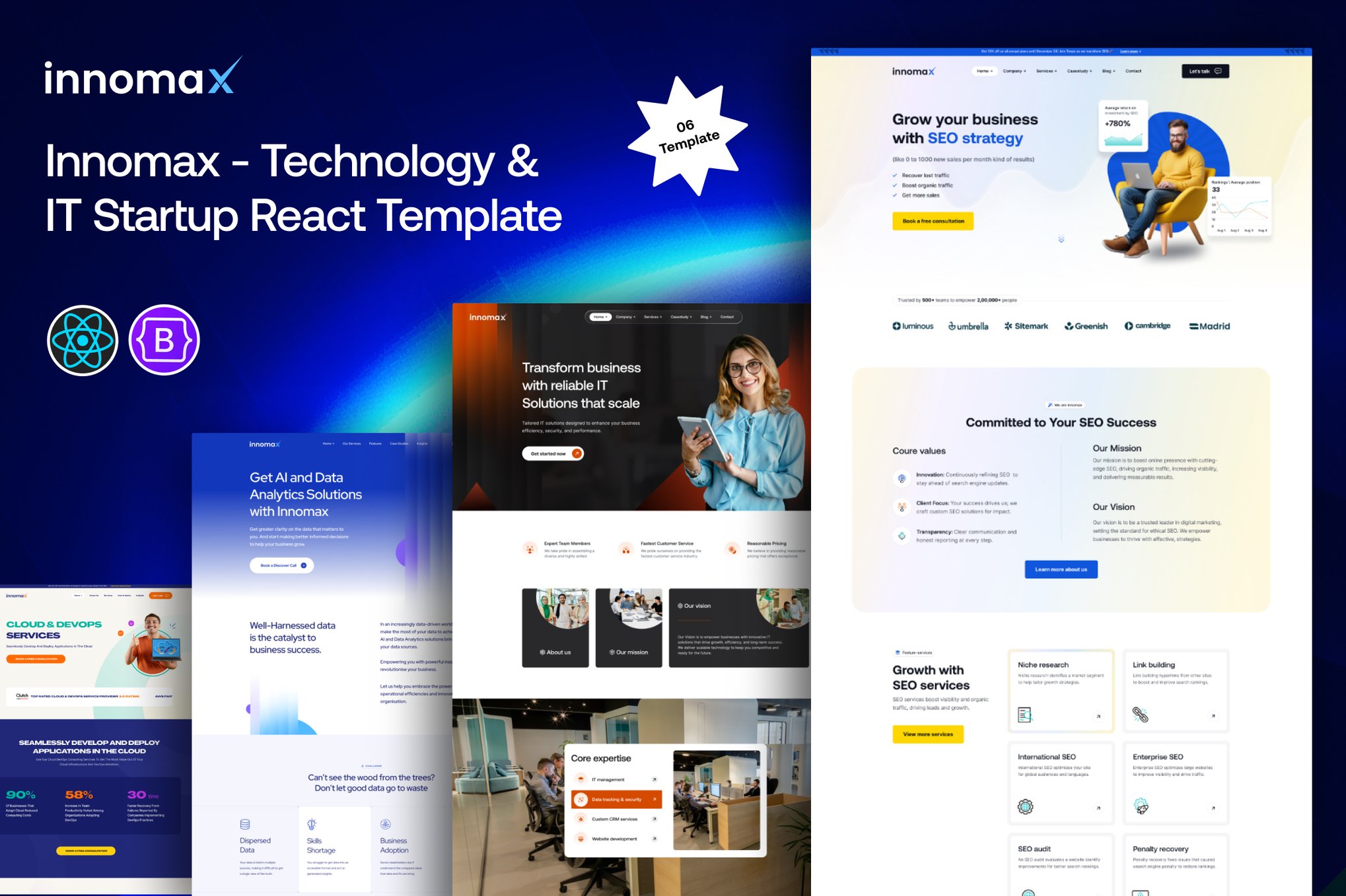 Download Innomax – a cutting-edge React Js template tailored for Technology & IT Startups, SaaS platforms, and AI solutions. Ideal for SEO agencies, Cloud services, and DevOps businesses, this template boasts a sleek, responsive design that guarantees a stunning display on any device. With complete customization control, including flexible layouts and color schemes, Innomax ensures a unique online presence that resonates with your brand identity. Featuring the latest Node version, Material UI, and Google Fonts integration, this template offers unmatched versatility and functionality. Join the ranks of satisfied users who enjoy 24/7 support and a seamless web experience with Innomax!