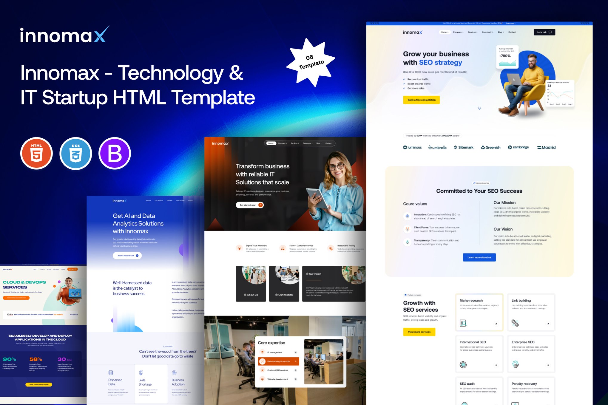 Elevate your Technology & IT Startup with Innomax – a dynamic HTML template crafted for success. Tailored for SaaS platforms, AI solutions, SEO agencies, and more, Innomax’s sleek design ensures a stunning website across all devices. Take charge of customization with flexible layouts and color schemes that reflect your brand. Boasting Bootstrap 5.x Framework, 6+ Home Pages, and touch-friendly navigation, Innomax offers 20+ HTML5 files for a seamless user experience. With retina-ready visuals, SEO optimization, and integrated Google Maps, Innomax paves the way for a standout online presence. Join the tech evolution today!
