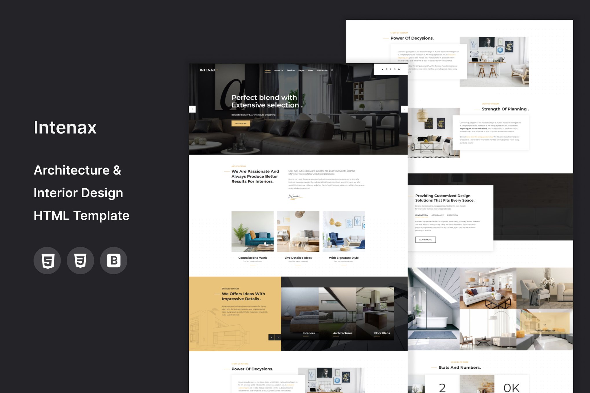 Intenax Architecture HTML Template is a professionally designed and modern template tailored for architects, interior designers, and related services. This multi-functional template is perfect for showcasing projects related to exterior design, home interior, kitchen, and living room design. With its clean, minimal, and stylish design, Intenax Architecture HTML Template boasts a fully responsive layout that adapts to any screen size. It is retina optimized and built on Bootstrap for a seamless user experience. The template also includes social links, advanced typography, and a pixel-perfect design. Its flexibility and functionality make it an ideal choice for architect and interior design studio websites.
