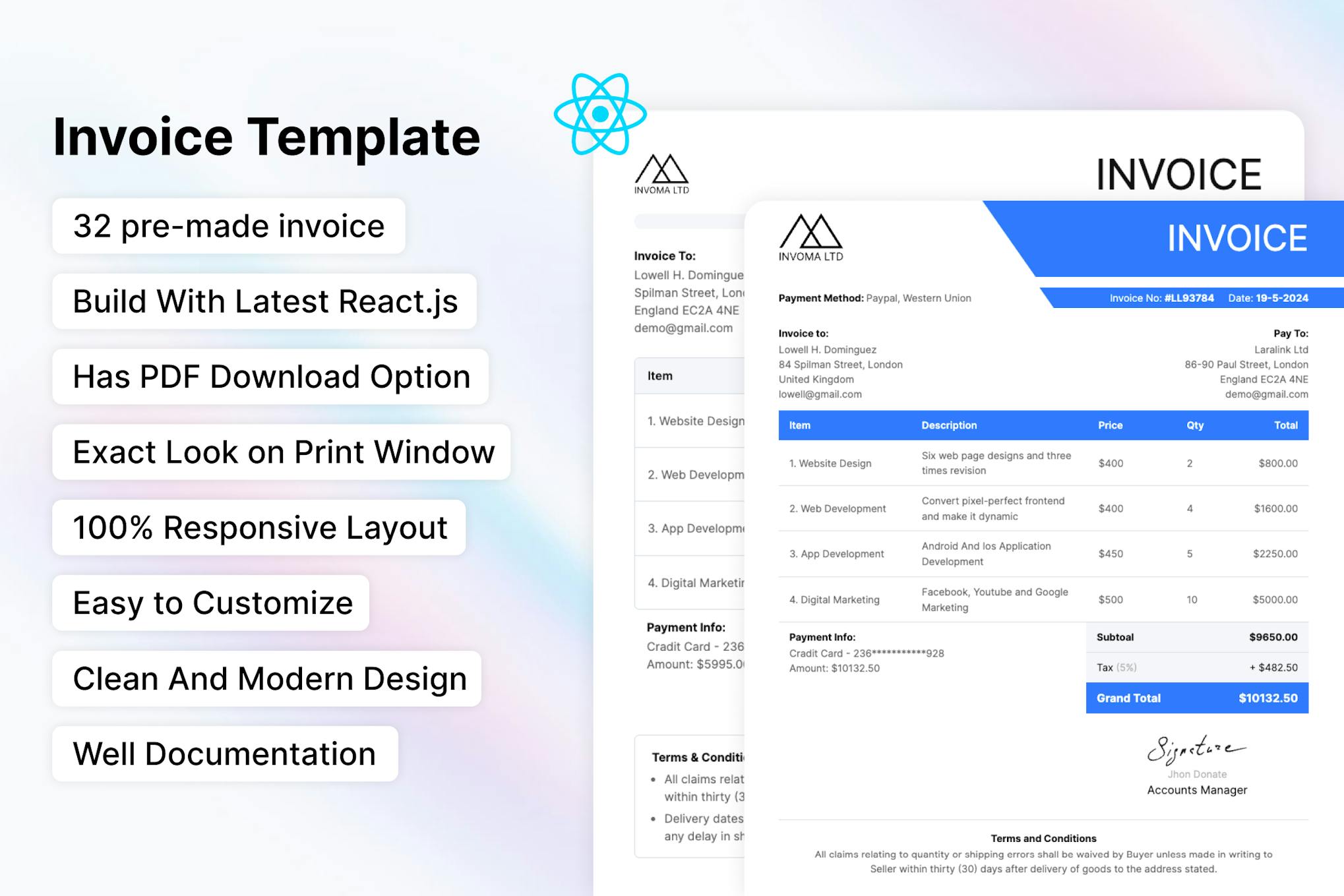 The Invoma Invoice ReactJS Template is a professional and versatile solution for creating invoices in a web application using ReactJS. With a modern and clean design, this template offers a user-friendly interface for managing invoices efficiently. It comes with various customizable components and layouts to suit different business needs. The template is responsive, making it accessible on various devices for seamless use. Overall, the Invoma Invoice ReactJS Template provides a practical and visually appealing solution for businesses looking to streamline their invoicing process.