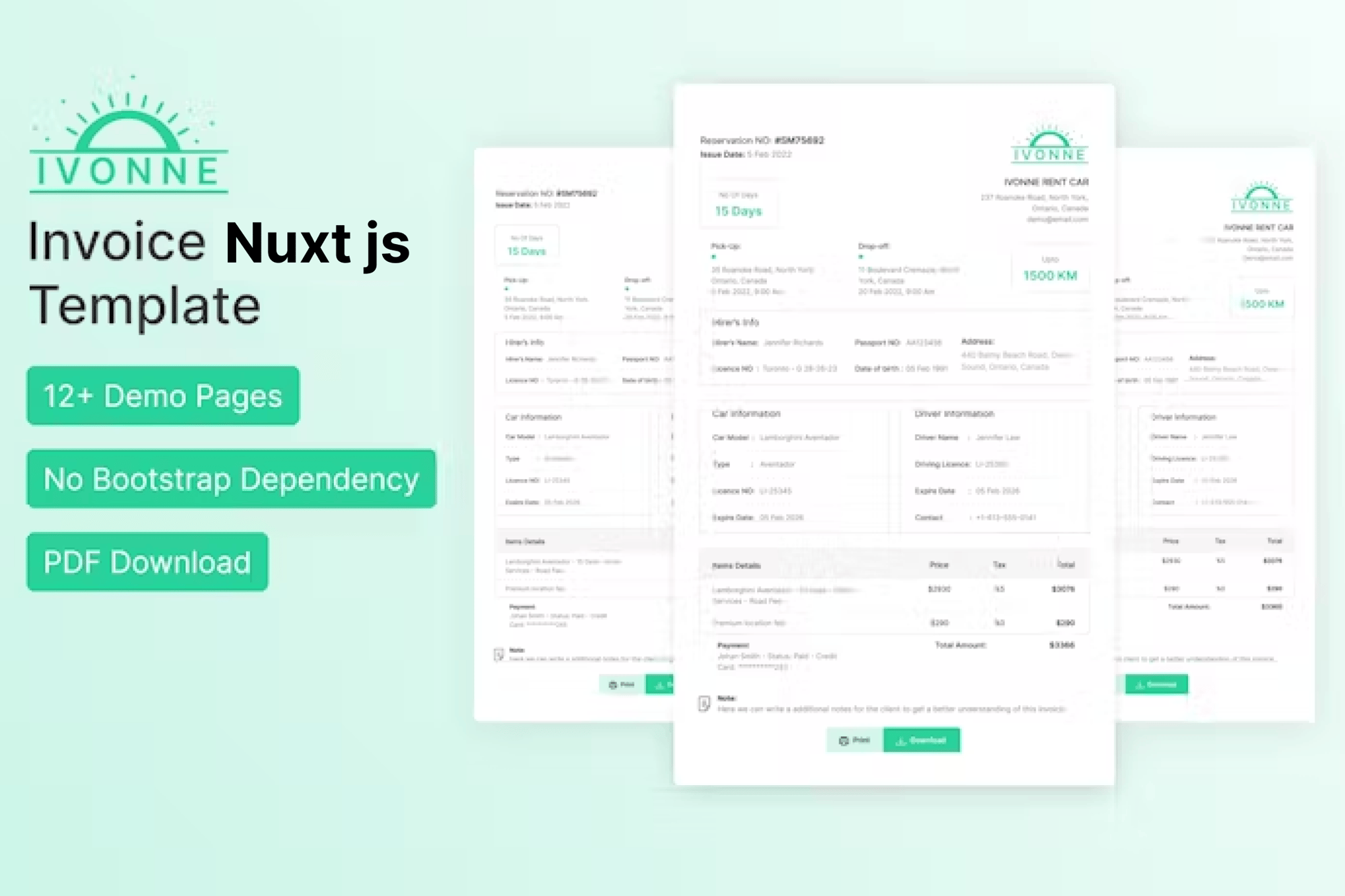 Ivonne is a sleek and modern Invoice Vue Nuxt 3 template designed for ease and efficiency. With 22 invoice and 4 receipt pre-built demos, it caters to a variety of industries including travel, hosting, medical, and more. This template boasts a clean and responsive design with no bootstrap dependency, ensuring lightweight integration into any web application. Ivonne offers PDF generation for each invoice along with a functional print button for immediate access. Its features include Vue 3 Nuxt 3 compatibility, W3C valid HTML, responsiveness, customization options, cross-browser compatibility, free Google Fonts, detailed documentation, and 24/7 customer support.