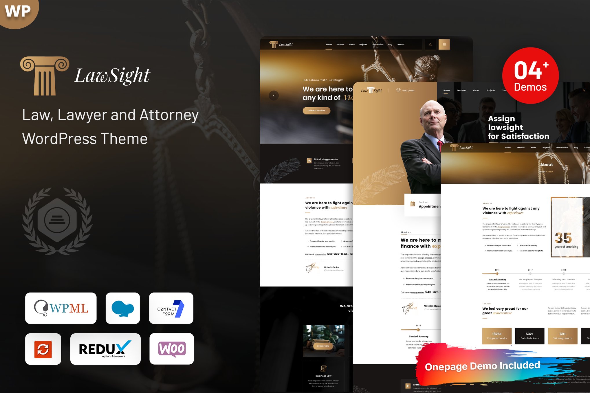 LawSight is a modern Law Business design suitable for law firms, attorneys, legal offices, politicians, and other relevant businesses. It features a Mega Menu, Footer Builder, WPBakery Page Builder for easy customization, one-click installation, flexible Mega Menu options, Slider Revolution plugin, powerful framework, onepage navigation, advanced theme and page/post options, unlimited color choices, parallax and video background support, newsletters integration, child theme readiness, WPML compatibility, Contact Form 7 compatibility, and detailed documentation.
